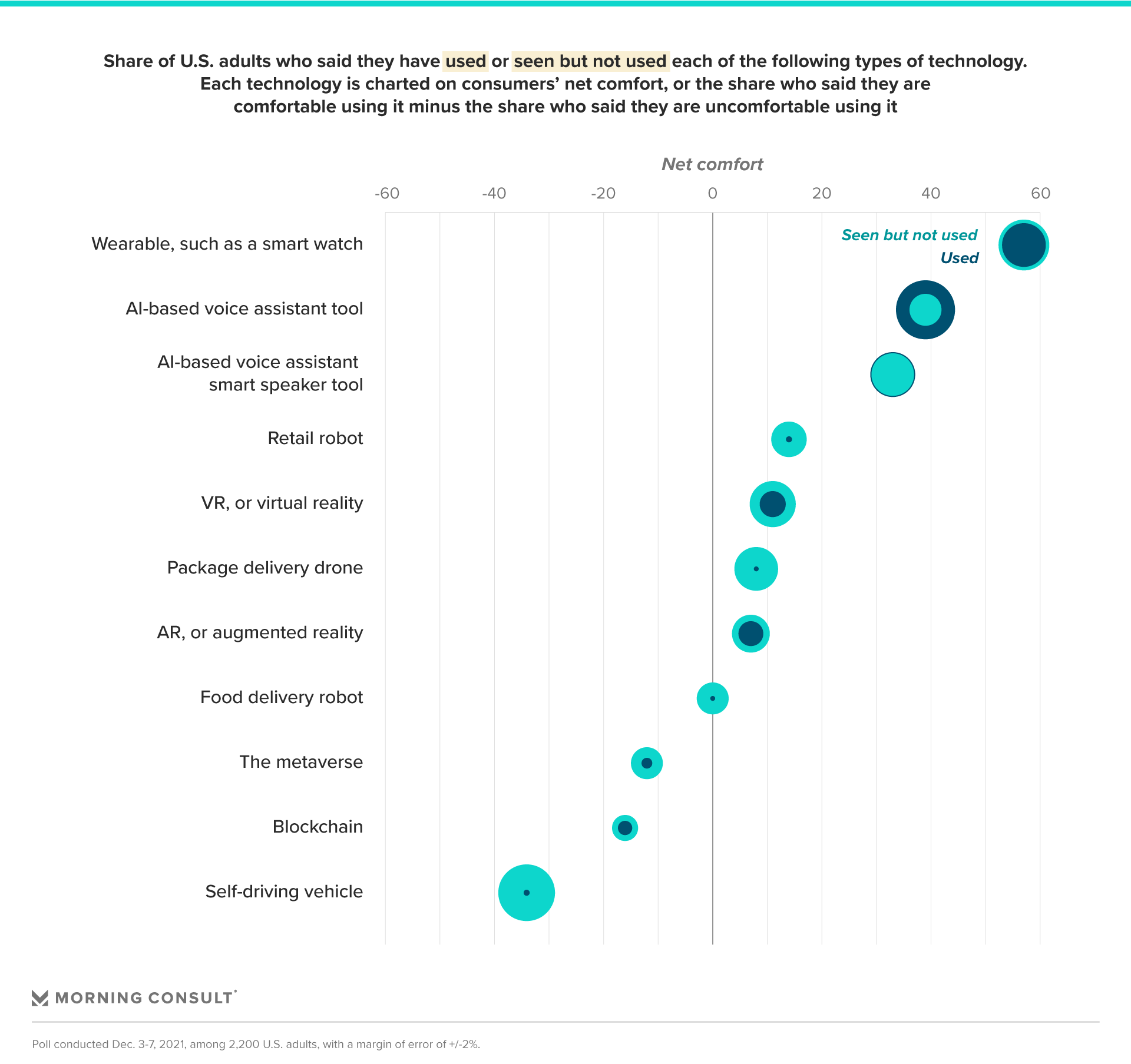 At a high level, people tend to feel positively towards new technology: Nearly two-thirds of all adults are excited about new technologies and believe they will improve daily life, according to a December 2021 Morning Consult poll; the same share feels that technology generally helps more than it harms.