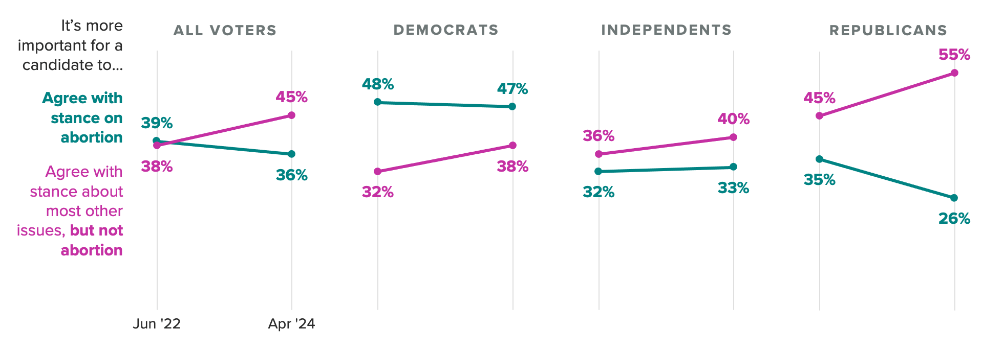 The latest data, conducted April 12-14, found that 45% of voters said it is more important for federal candidates to agree with their positions on most other issues even if they disagree about abortion access, up from 38% in a June 2022 survey. Over the same time period, the share of voters who said it is more important for them to agree with a candidate on abortion access than other issues declined slightly (from 39 to 36%).
