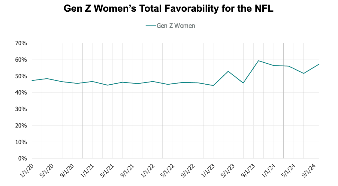 While that trend is largely driven by a rebound among Republicans, the league has also made additional gains, especially among young women. Much of this growth coincided when Taylor Swift and Kansas City Chiefs tight end Travis Kelce went public with their relationship.
