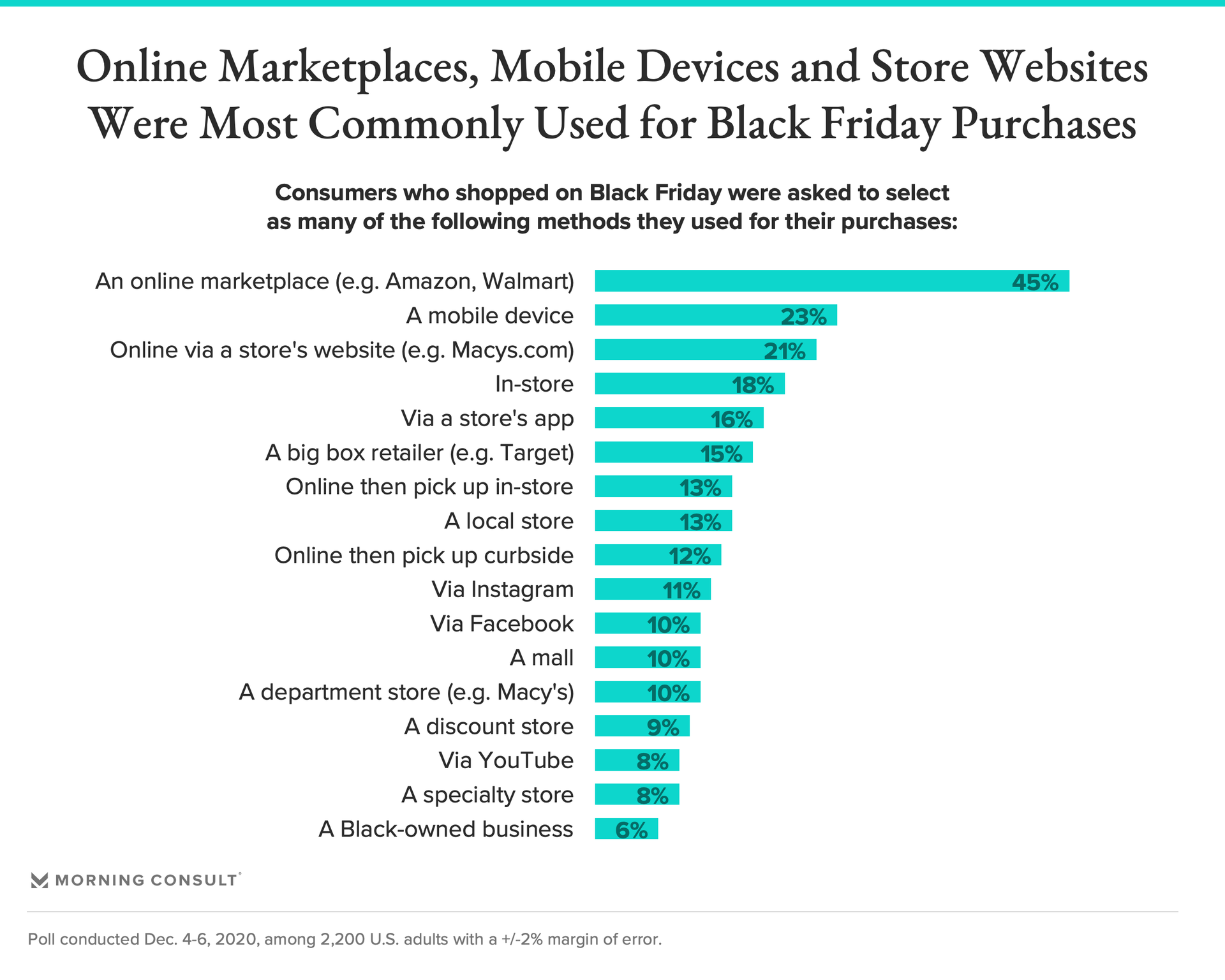 As expected, COVID 19-related health and safety concerns were the primary reason behind online-first Black Friday shopping, though sizeable minorities also cited convenience (40 percent), preference (31 percent) and better sales (31 percent) as reasons for shopping primarily online. Preference for in-store shopping (30 percent), trust in retailers’ COVID-related compliance (29 percent) and the desire to see or try items before purchasing them (26 percent) were top reasons driving in-store Black Friday shopping, suggesting that though e-commerce has its benefits both in the pandemic and during more normal times, familiarity with and the tangible nature of in-store shopping are likely to protect its appeal even as digital shopping options proliferate.