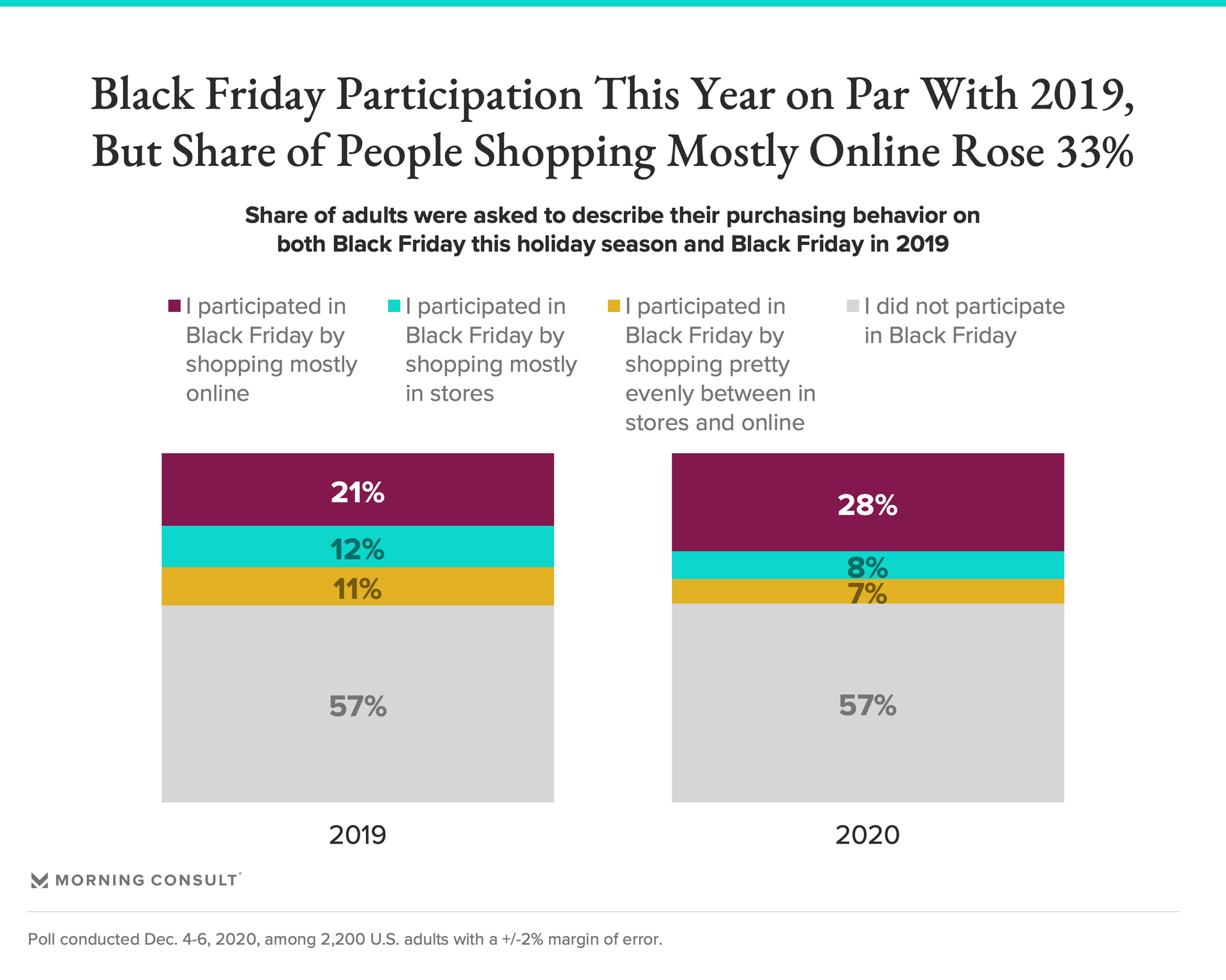 Indeed, while the share participating in Black Friday overall remained largely consistent year on year, the share participating mostly online versus partially or mostly in store rose notably, by 7 points. It’s worth noting that 88 percent of those who participated in Black Friday this year also participated in Black Friday last year; 1 in 10 2020 Black Friday shoppers (the remaining 12 percent) were newcomers to this shopping event versus 2019. Interestingly, those who took part both years seemed to stay consistent in their preferred shopping method year on year.