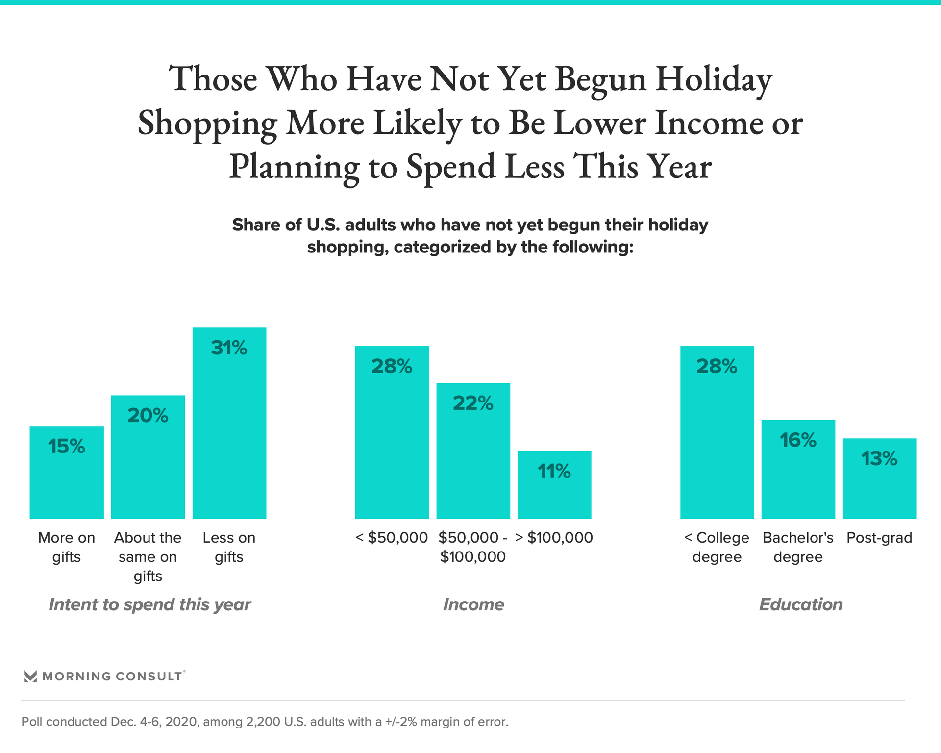 But digging deeper into those who have yet to begin holiday shopping reveals a worrying trend: Americans who have not yet begun their holiday shopping are more likely to be lower income and more likely to spend less on gifts this year. While this could be a coincidence, those expecting to spend less this holiday season are also much more likely to put off the start of gift shopping until late December (56 percent plan to do so) compared to their higher-spending peers who’ve also not yet begun gift shopping (71 percent of whom plan to start their gift shopping in early December). With a growing share of Americans, particularly lower-income cohorts, more financially vulnerable, this suggests that holiday gift purchases may never ultimately be made among those who are struggling financially this season.