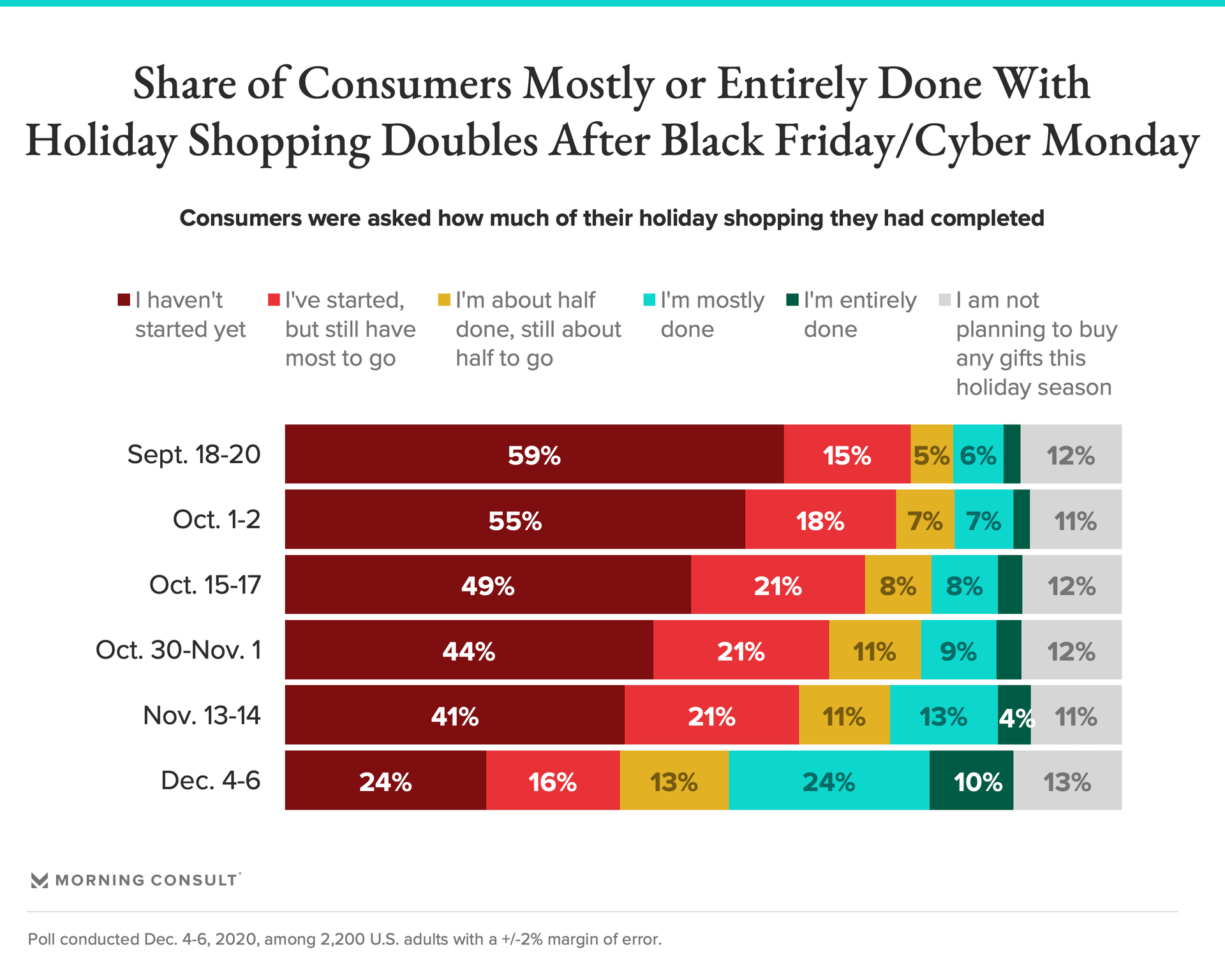 Only a quarter of Americans (24 percent) have not yet started their holiday shopping as of early December, while the share saying they are either mostly or entirely done is up 17 percentage points since before BFCM to 34 percent. Indeed, at 42 percent and 46 percent respectively, those who shopped on Black Friday or Cyber Monday are significantly more likely to be mostly or entirely done shopping compared to those who didn’t participate in either shopping event (just 28 percent of those who didn’t participate in Black Friday or Cyber Monday said the same).