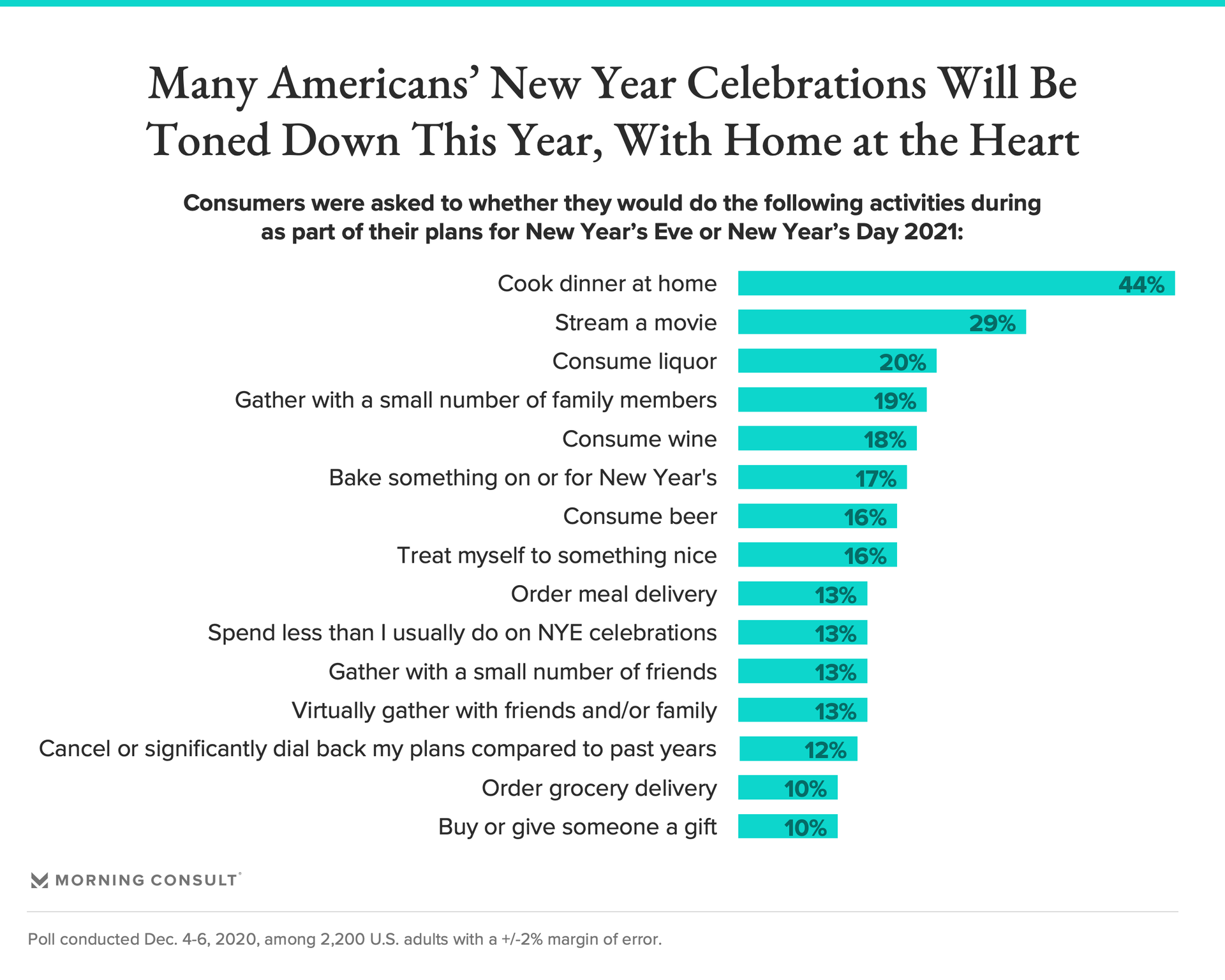 A stark departure from typical New Year’s traditions, the most common activities Americans cite for ringing in 2021 include cooking dinner at home (44 percent) and streaming a movie (29 percent).