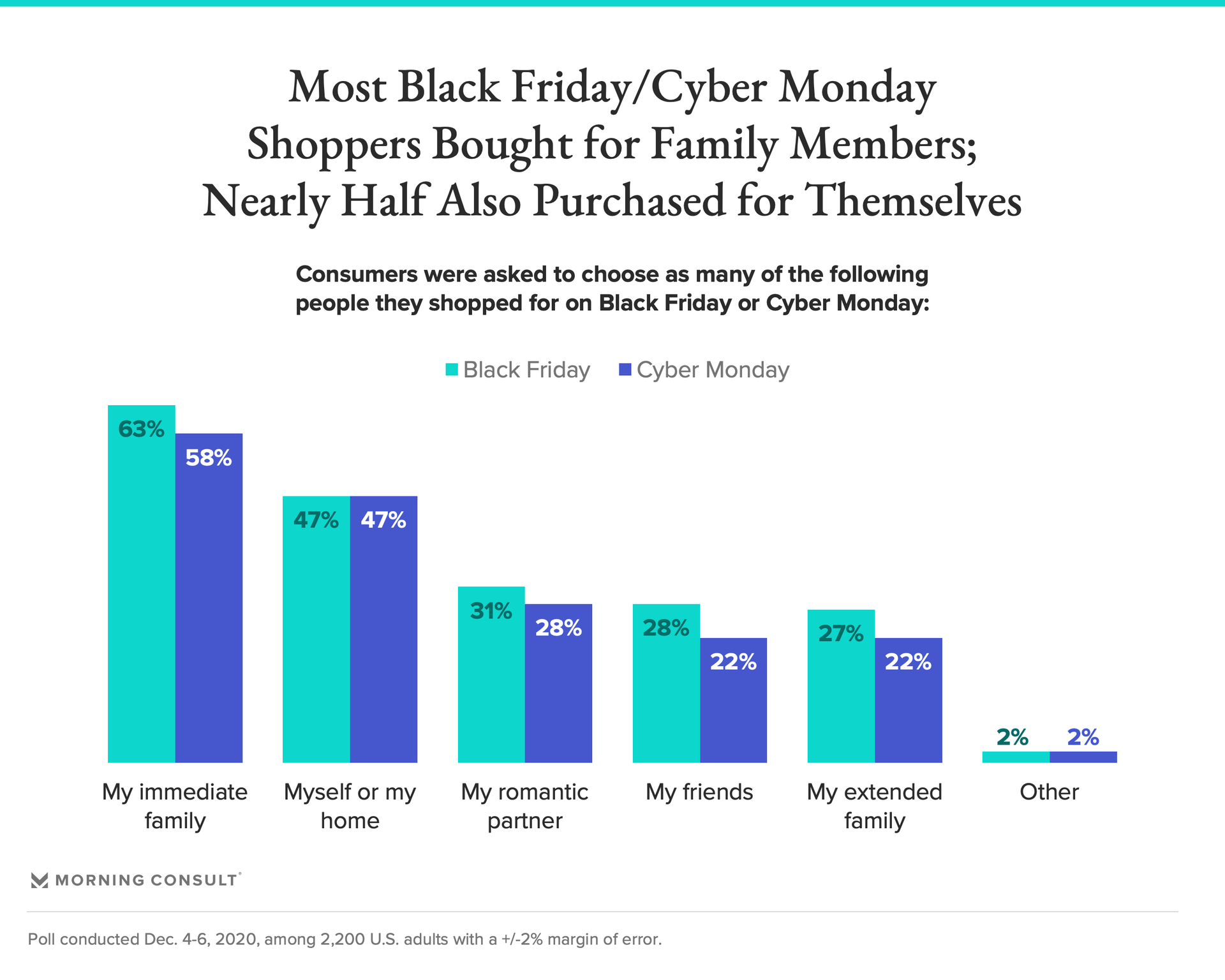 Most BFCM purchases were for shoppers’ immediate family members, though nearly half of all shoppers also report picking up items for themselves or their homes.