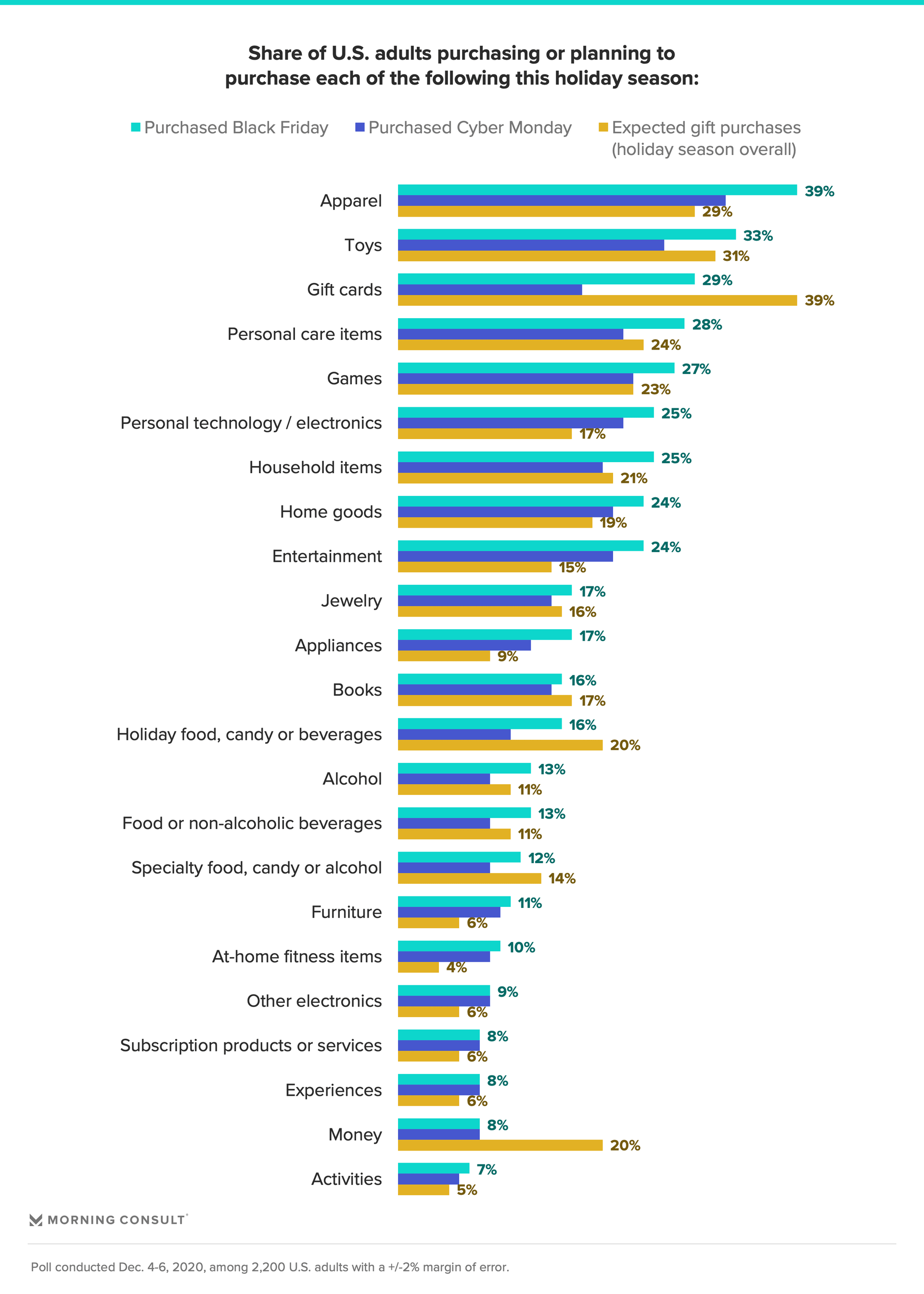 Gift cards were expected to be far and away the most popular gift category this holiday season, but apparel and toys were the most commonly-purchased categories during both shopping events.