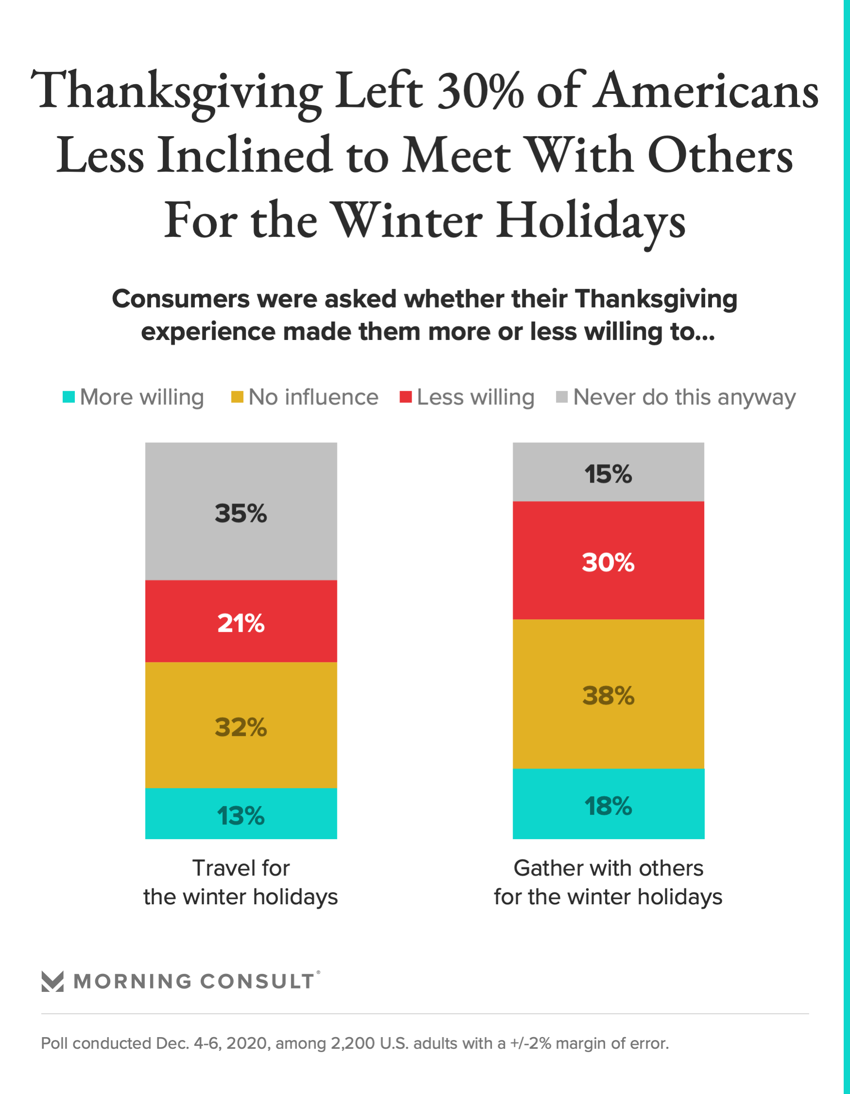 These audiences feel similar willingness to gather with others over the winter holidays, though a greater share of Americans overall indicate they’re now less willing to do so because of their Thanksgiving experiences (30 percent).