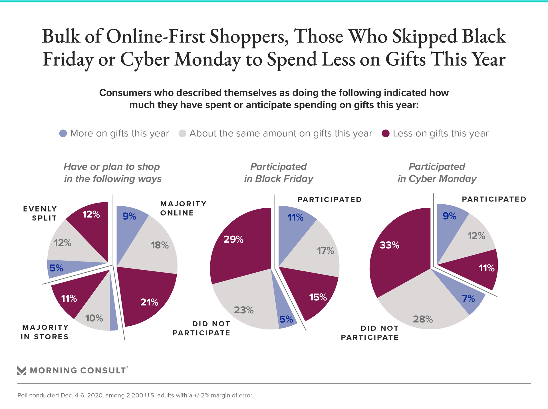 Still, the majority of the population reports having done either none of their holiday shopping on BFCM weekend or not planning to do any in the first place. And, just 8 percent and 7 percent of Americans, respectively, participated in Small Business Saturday or Giving Tuesday, likely due to a combination of the relative novelty and niche nature of these newer shopping events and consumers’ priorities being especially deal-oriented given the events of this year.
