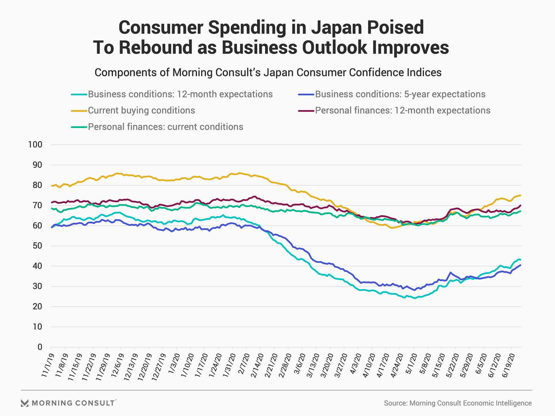 Japanese consumers are well positioned to increase spending over the next couple months as improvements in their expectations of business conditions drive confidence higher. Generous unemployment benefits and a tight labor market protected Japanese workers from the financial hardship felt by Indians and Chinese, which provides them with the financial means to return to spending.