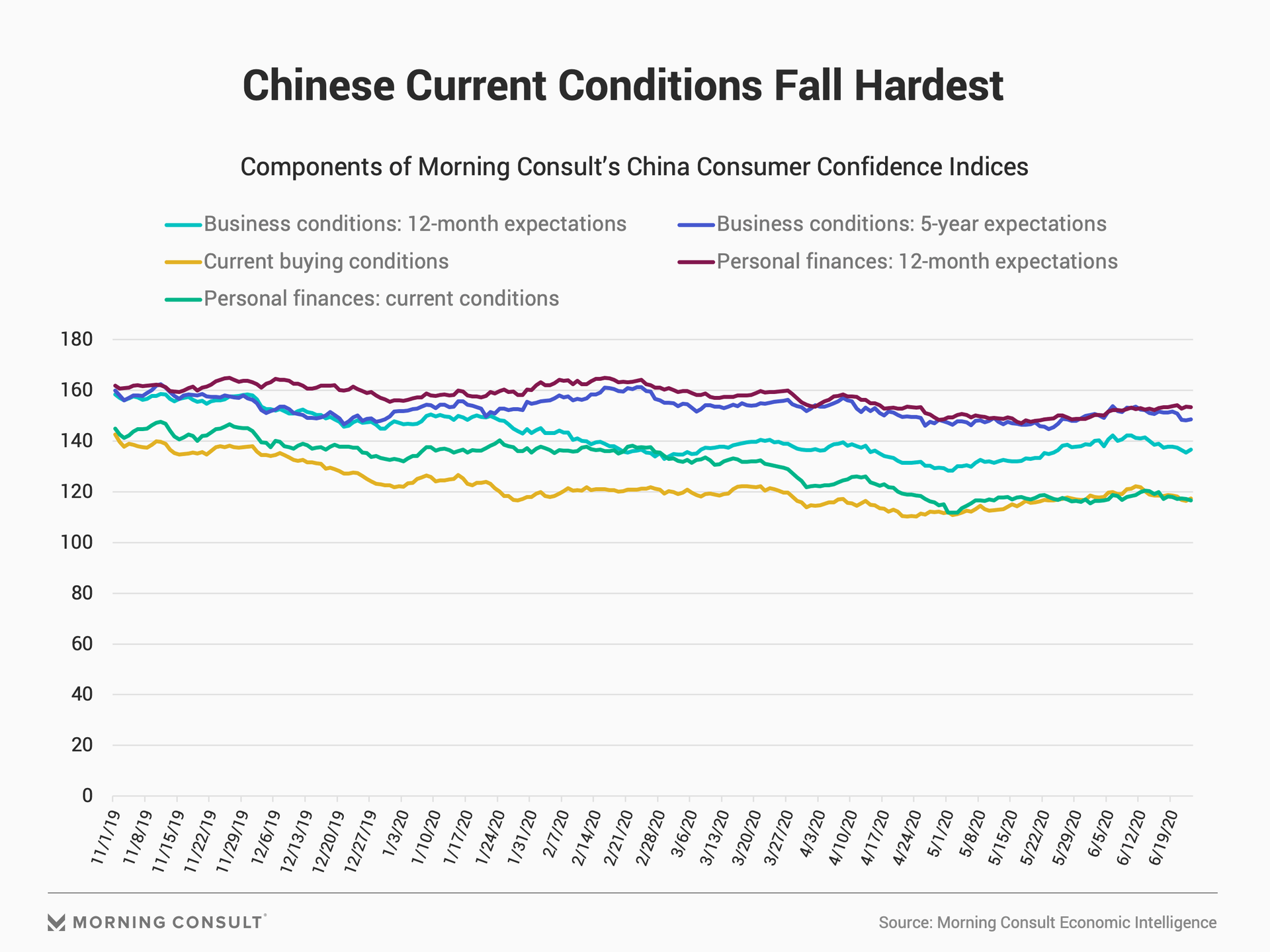 This data also shows no visible effect of the heightened military tensions between China and India on consumers in those countries or in China’s neighbor, Japan. Consumers do not believe that the June 15 border battle between the world’s two most populous countries, which killed 20 Indian soldiers, will affect business conditions in their own country as a whole or their own personal finances, which indicates that they do not believe tensions will further escalate.