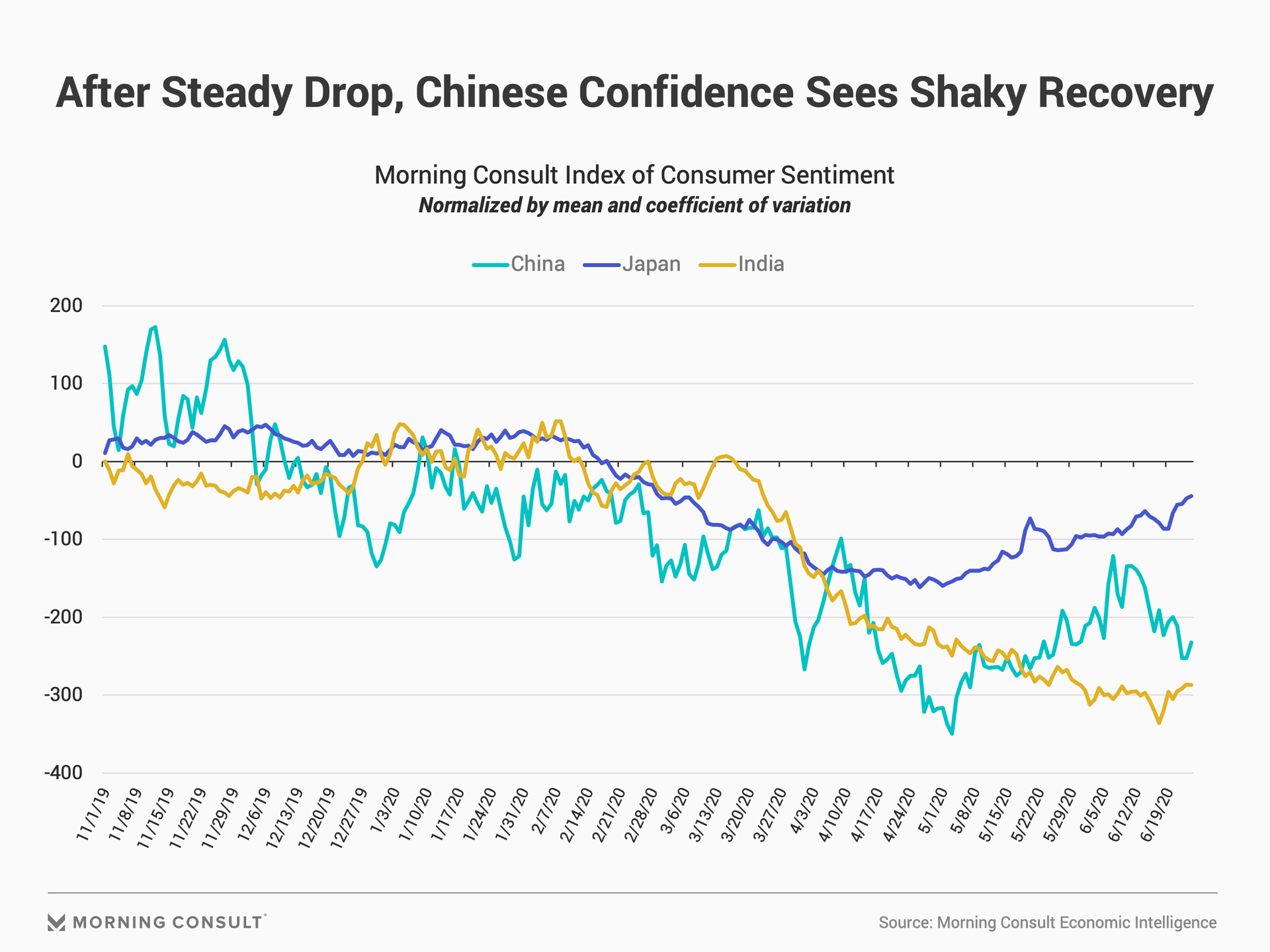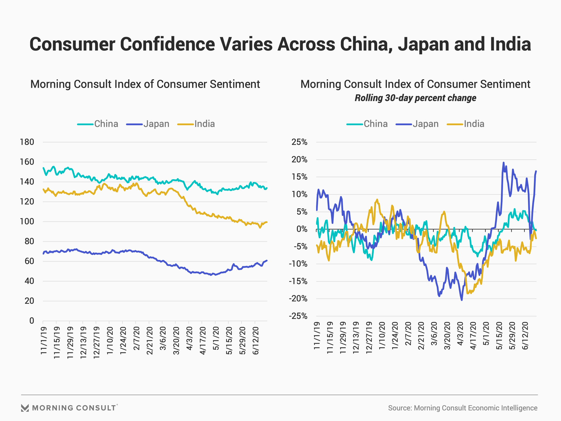 The current state of consumer confidence in China, Japan and India provides insight into the economic toll exacted by the coronavirus pandemic in those countries and the prospects for a rebound in consumer spending and economic growth through the end of the year.