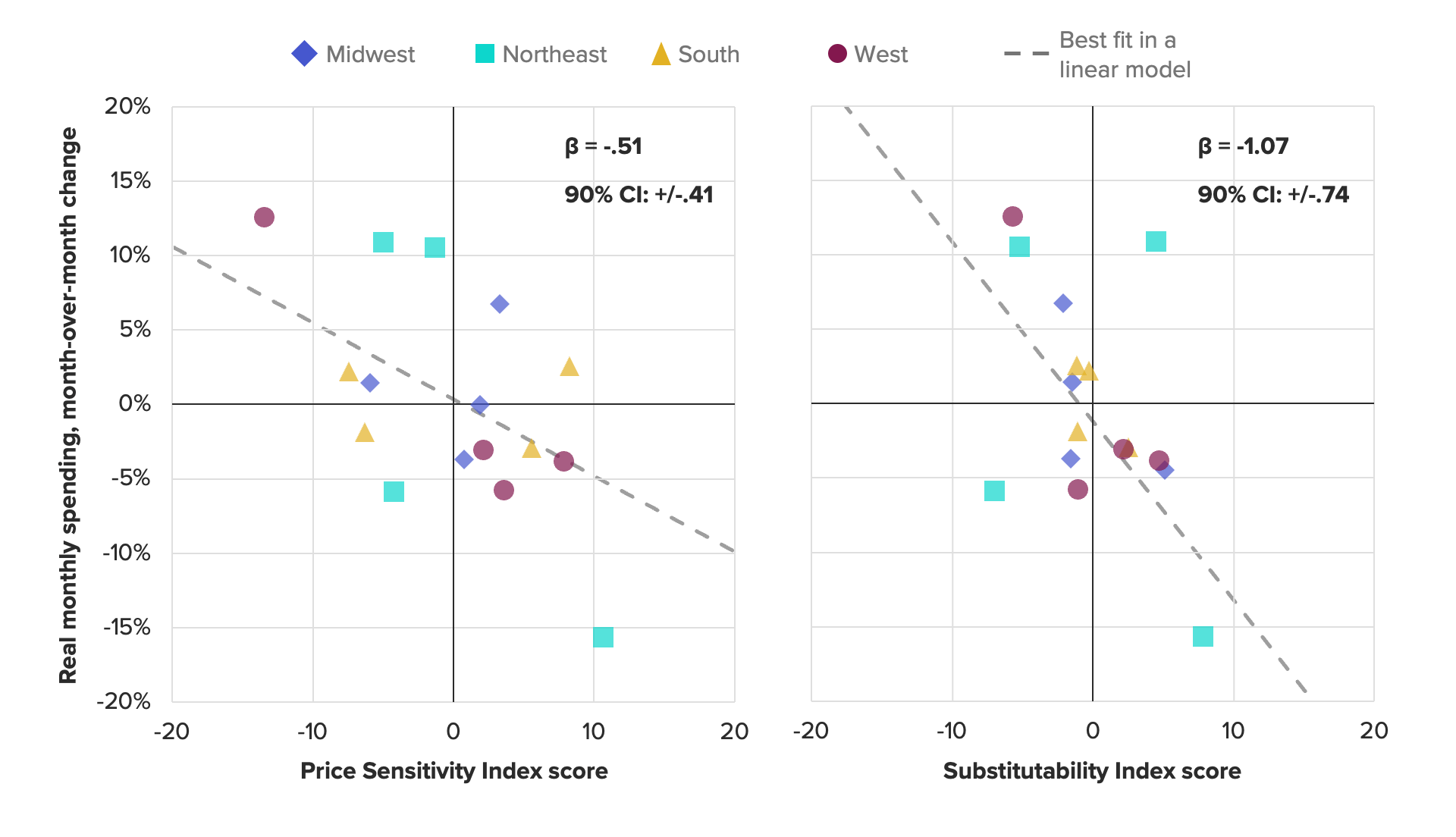 Building on these results, we then use data from Morning Consult’s Household Finances and Spending Survey to demonstrate that regional inflation-adjusted consumer spending patterns are strongly negatively associated with both price sensitivity and substitutability. This is true even after we control for fixed regional factors potentially correlated with both. It is this connection between these two indexes and consumer spending that prompted us to combine our Household Finances & Spending and U.S. Supply Chains & Inflation reports under the single banner of Consumer Spending & Inflation.