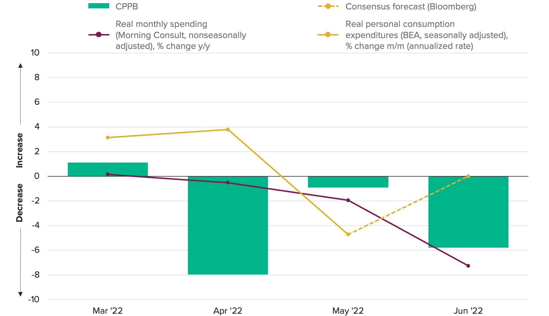 Above, we show how the CPPB has evolved over the past four months in comparison with real spending growth from our survey. Both the index and real spending have consistently deteriorated since March, with large declines in the CPPB in both April and June. For comparison, the chart also displays recent values of growth in real personal consumption expenditures from the Bureau of Economic Analysis. With real PCE also now weakening, the CPPB helps in part to explain why, providing a leading signal that consumer purchasing power is shrinking as inflation tightens its grip on the consumer wallet.