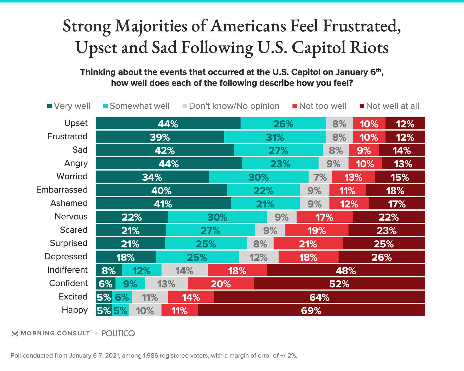 At least 69% of registered voters report feeling sad, frustrated or upset following yesterday’s riots in Washington.