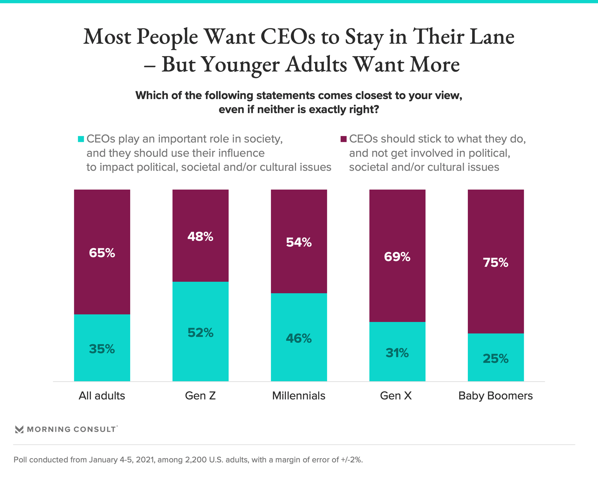 Although most consumers think a CEO should stick to their business and not get involved in political discourse, a fair share (35 percent) say the opposite — with younger consumers especially adamant about chief executives doing more than oversee their companies.