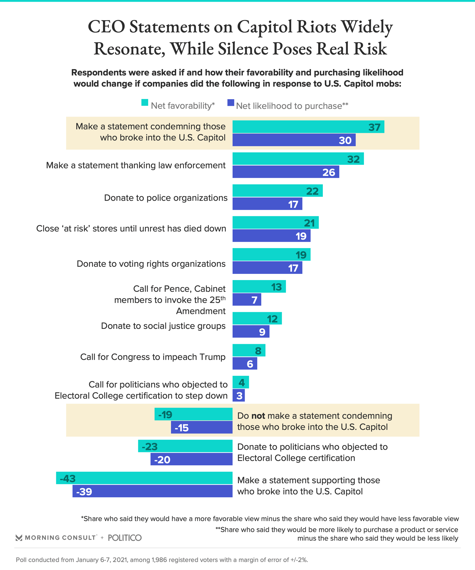 50% say they have a more favorable view of companies who condemn yesterday’s events, while 43% would be more likely to purchase from companies doing so.