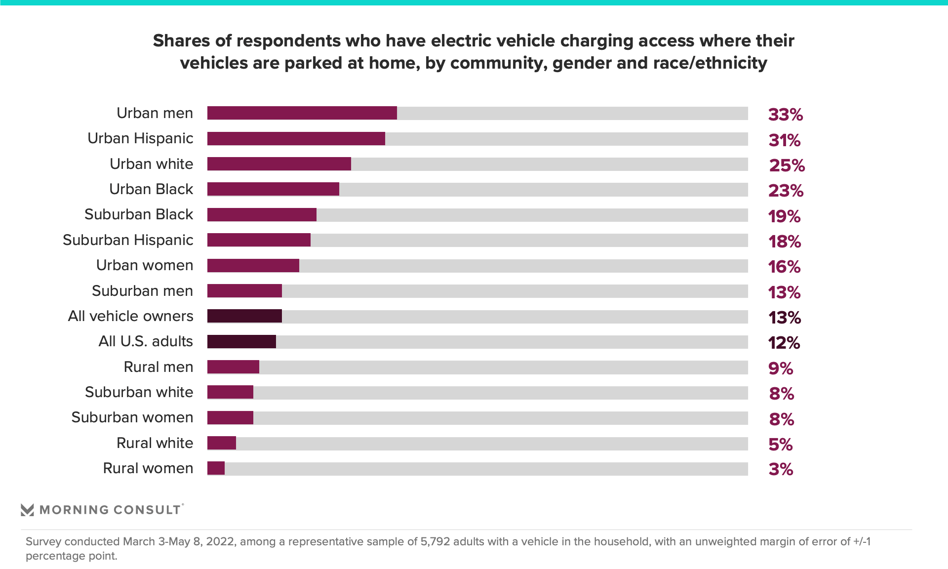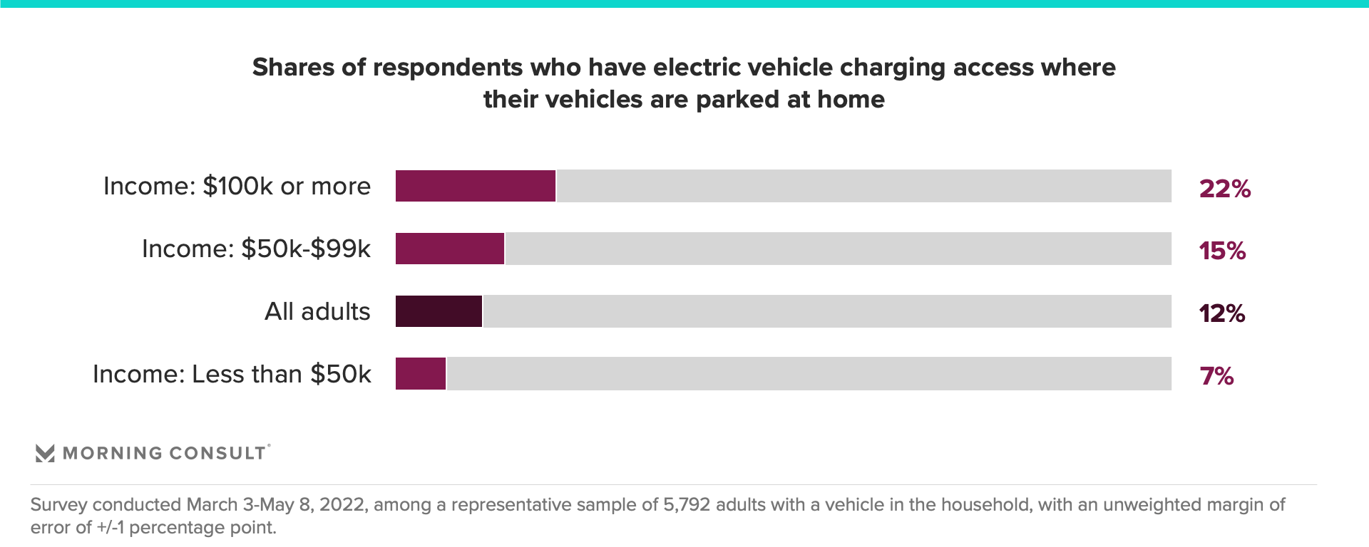 Morning Consult research shows much variation in charging access below the surface. One of the largest gaps in charging access is based on income levels. While 22% of those with annual household incomes of $100,000 or more report having access, that figure drops to 7% among those in households that make below $50,000 annually.