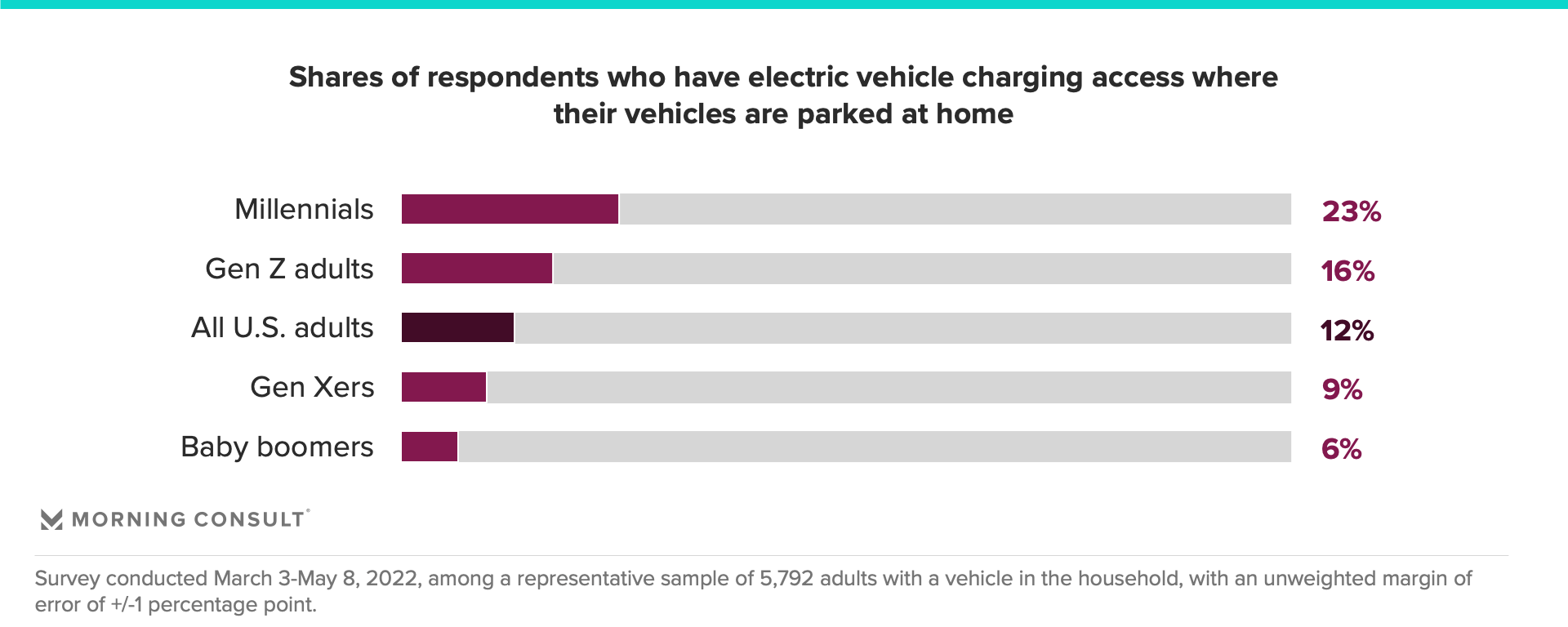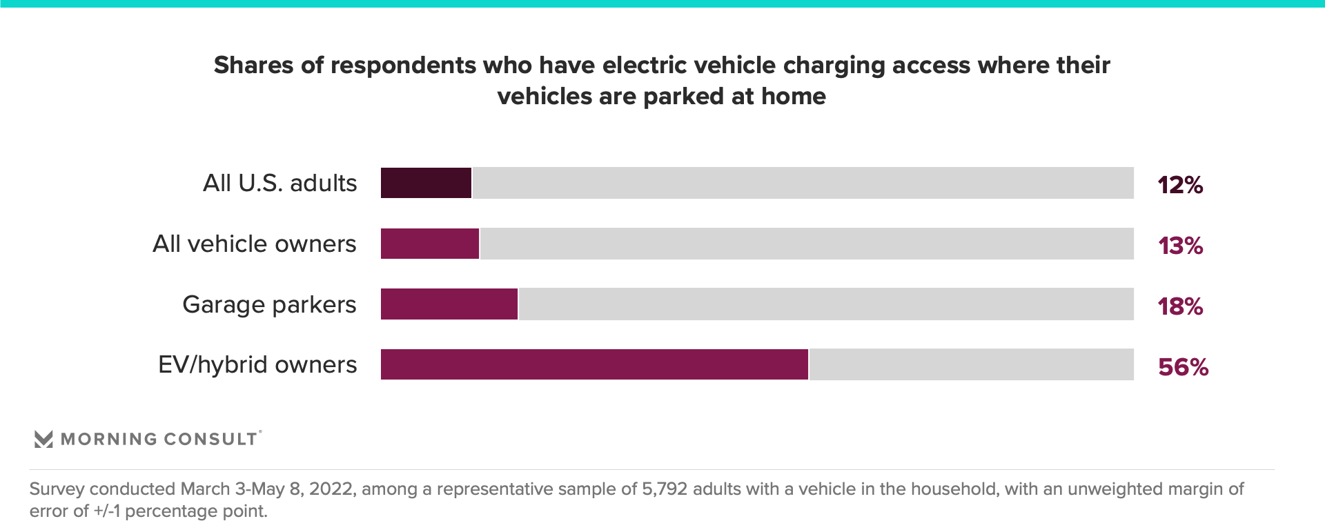 Morning Consult research shows it’s clear why: Just 12% of U.S. adults have access to EV charging at home. Although that figure ticks up among those who actually own an EV or hybrid, it only climbs to just over half.