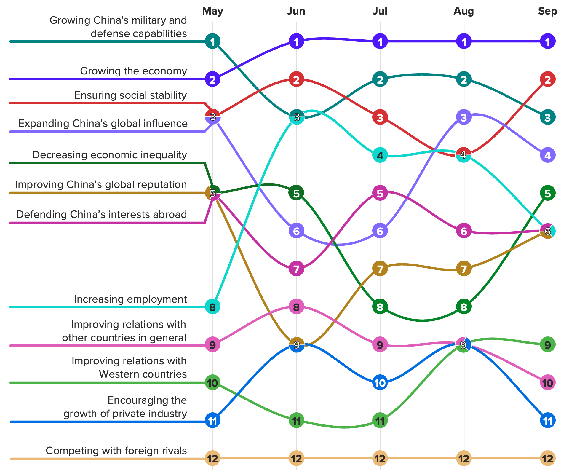 In terms of rank, both issues fell one spot from the first survey in May, though a desire to improve China’s global reputation has improved three spots since June.