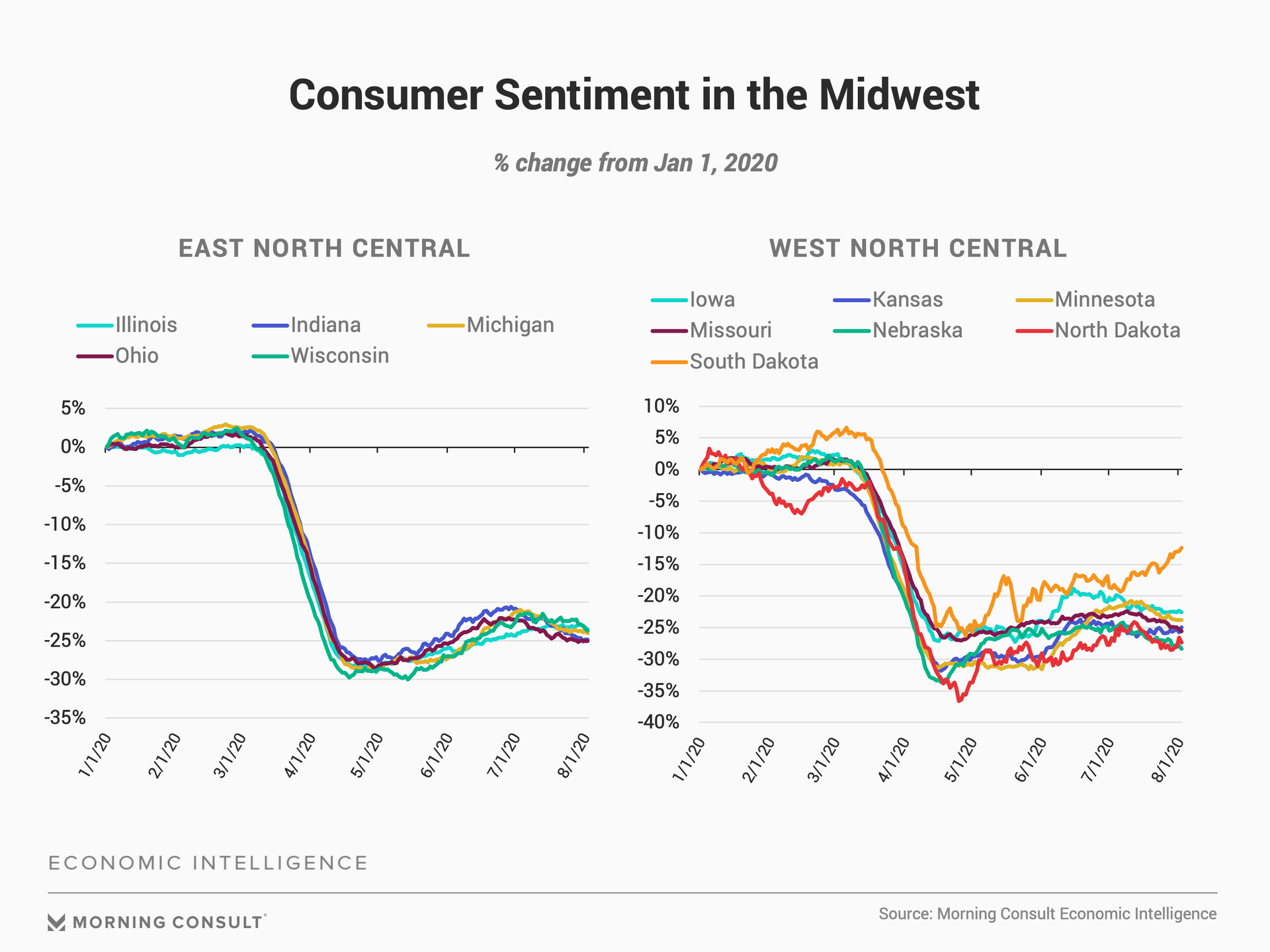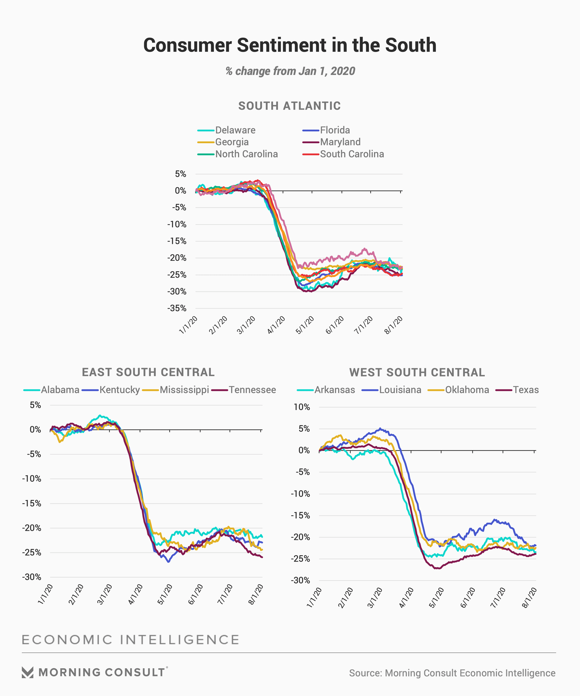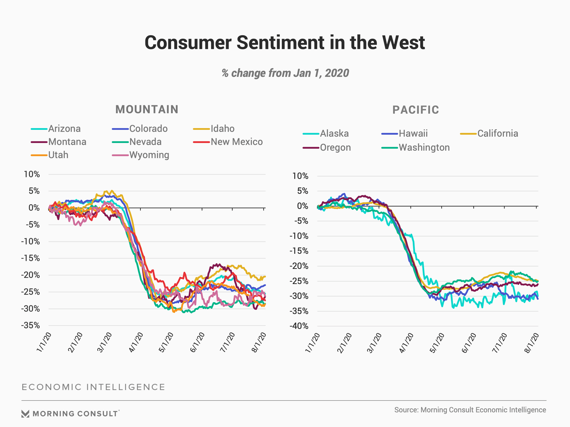 Consumer confidence fell in 41 of the 50 states from July 1 through Aug. 1. The largest monthly declines occurred in the South and West, regions where the number of new daily coronavirus cases rose most in July. The Index of Consumer Sentiment in Florida, which has been one of the recent hotbeds for the virus, fell 3.7 points, the 11th largest decrease in July.