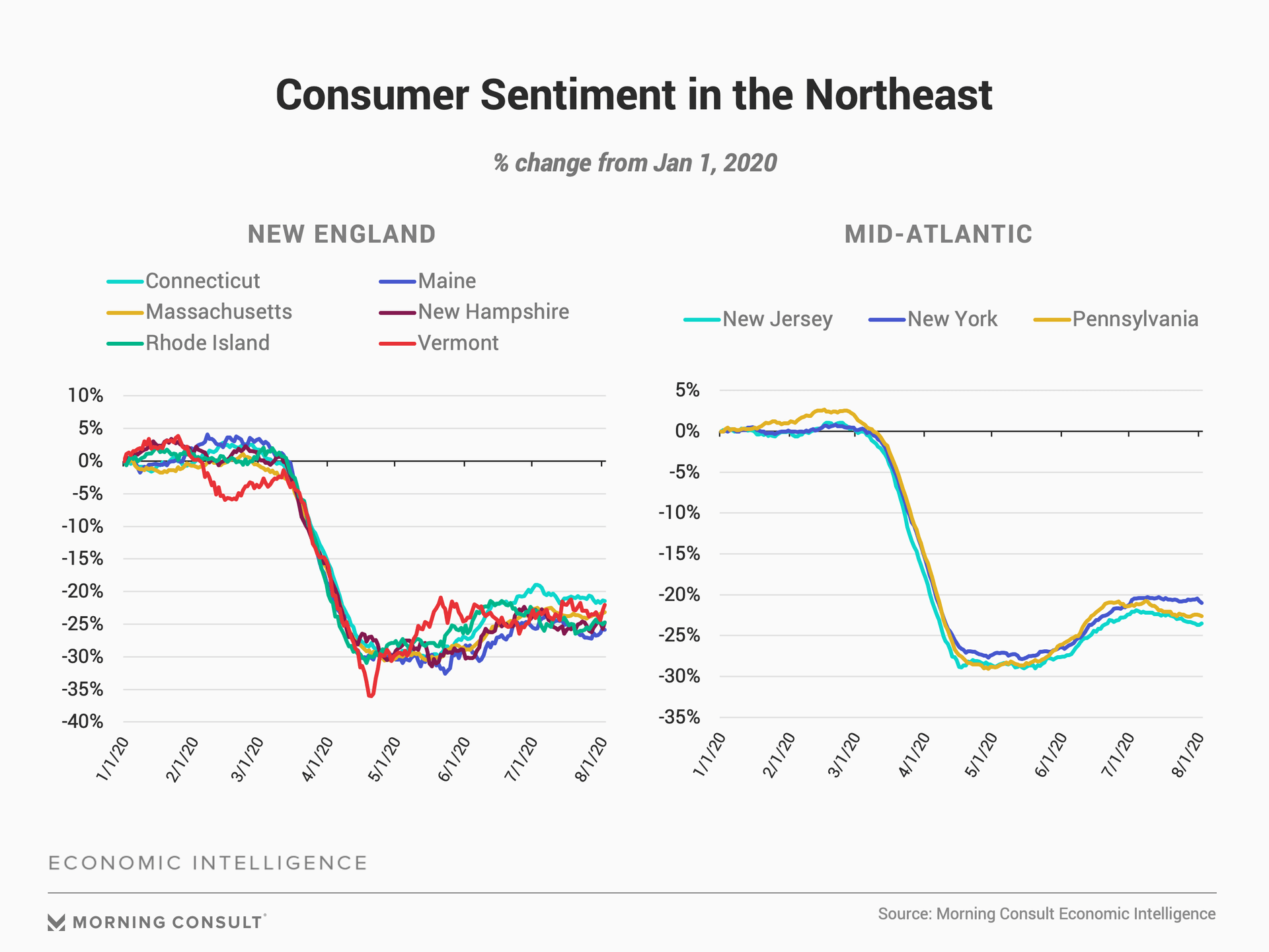 How we measure consumer confidence: Each day, Morning Consult surveys over 6,000 U.S. consumers on their views regarding current and future personal financial conditions and business conditions in the country as a whole. The results from those survey interviews are inputted into the Morning Consult Index of Consumer Sentiment (ICS), with higher numbers indicating higher consumer confidence. For context, the ICS at a national level was 85.99 as of August 1. A full methodology is available at the bottom of the page.