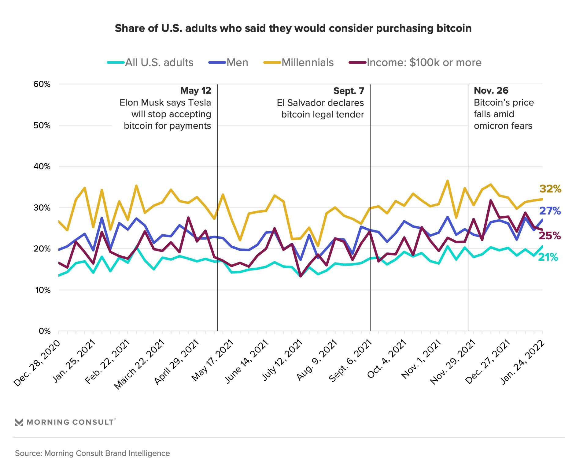 Retail investors’ interest in bitcoin hasn’t dampened since the price began dropping in November 2021. According to Morning Consult Brand Intelligence tracking, 21 percent of adults are considering purchasing bitcoin as of last week, equal to the share who said the same at the beginning of November.