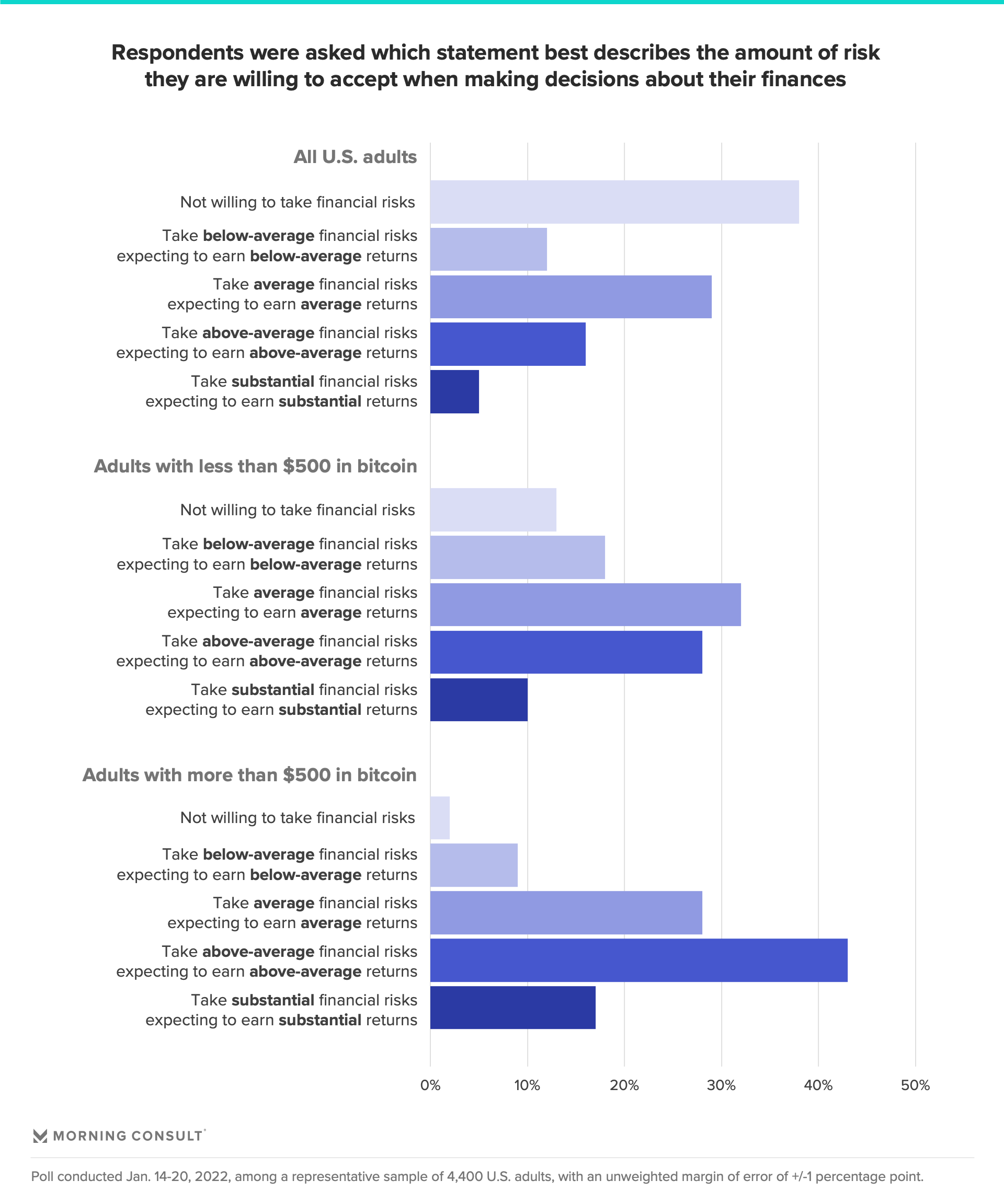 Risk tolerance also seems to increase in proportion to bitcoin ownership: Adults with more than $500 in bitcoin are about 60 percent more likely than those who own less than $500 in bitcoin to be willing to accept substantial or above-average risks.