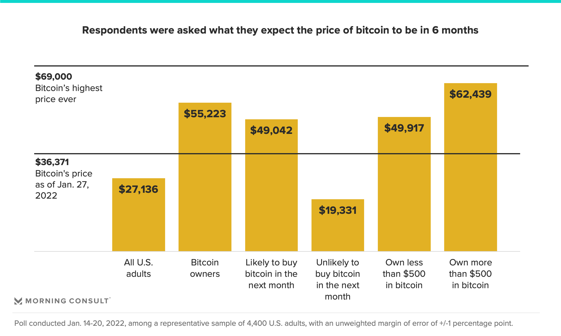 The highest estimate came from respondents who own more than $500 in bitcoin. This group expects bitcoin’s price to reach $62,439 in six months — a few thousand dollars shy of its all-time high value of $69,000 in November 2021. But bitcoin owners who have been in the cryptocurrency market for more than a year are also optimistic about the next six months, anticipating that the price will reach $57,950.