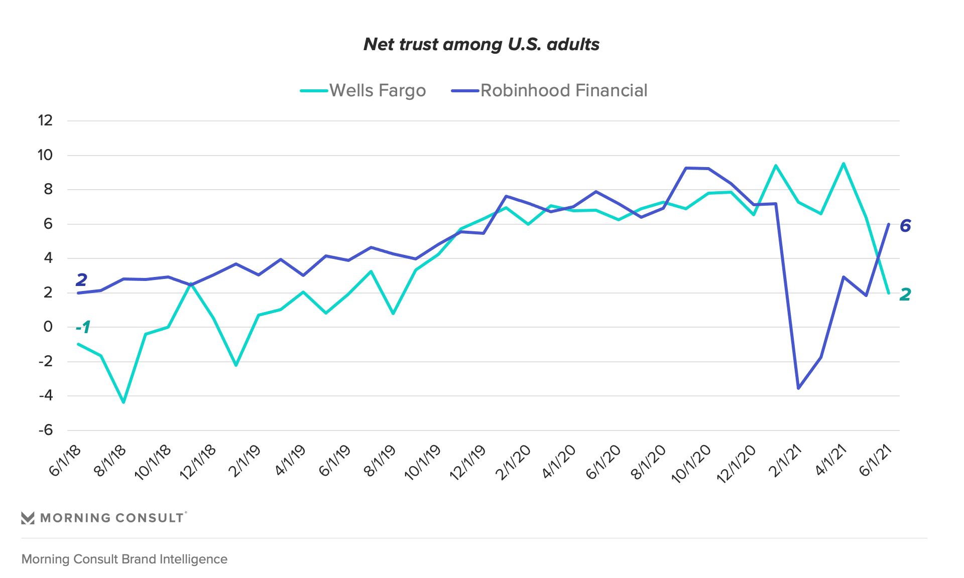 The Robinhood brand has shown impressive resilience in trust throughout 2021, despite the stock trading app’s central role in the GameStop trading rollercoaster. The brand has almost completely recovered its net trust since January, making the same gains in a matter of months that Wells Fargo has struggled to rebuild following its -- albeit, more scandalous -- account fraud controversies.