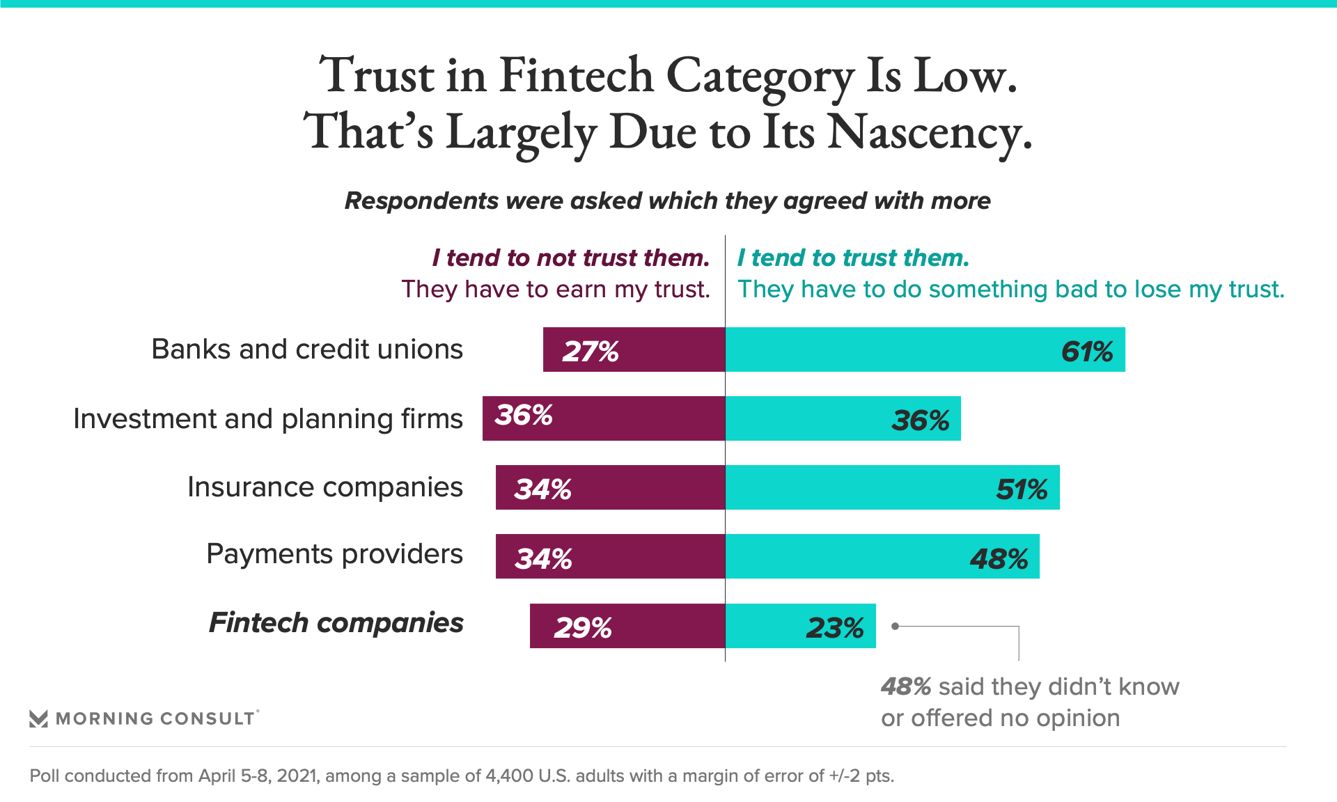 Just 23 percent of respondents said they naturally trust fintech companies. Forty-eight percent gave no opinion on the question.