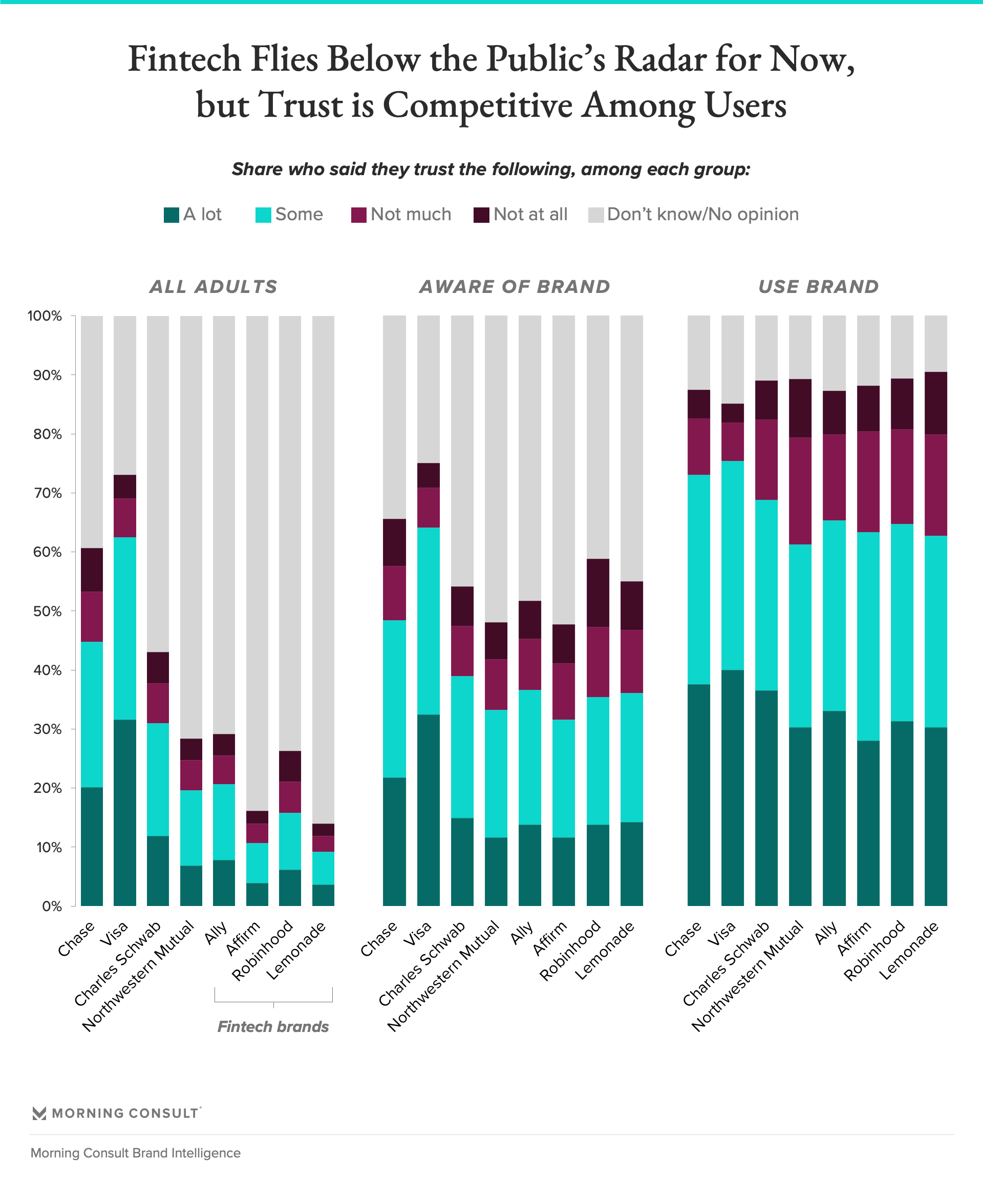 Analysis at the brand name level, using Morning Consult Brand Intelligence, reveals a similar pattern as our Research Intelligence data: a large portion of adults have no opinions on fintechs, which translates to less overall trust compared to traditional financial services brands.