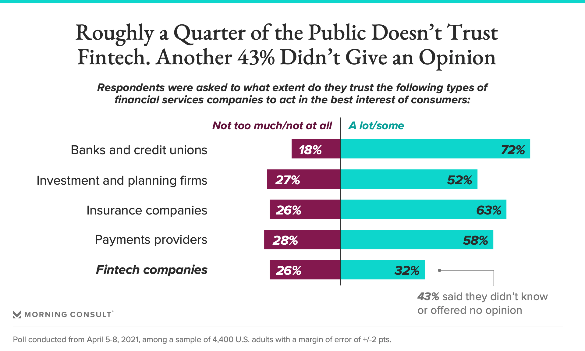 Morning Consult’s recent Most Trusted Brands: Financial Services report focused on the U.S. consumers’ trust of broad financial services categories that consumers most commonly interact with -- banks and credit unions, investment and wealth management providers, insurance providers, and payments providers -- but the survey of 4,400 U.S. consumers also gauged trust in fintechs, described in the poll as “financial technology companies.”