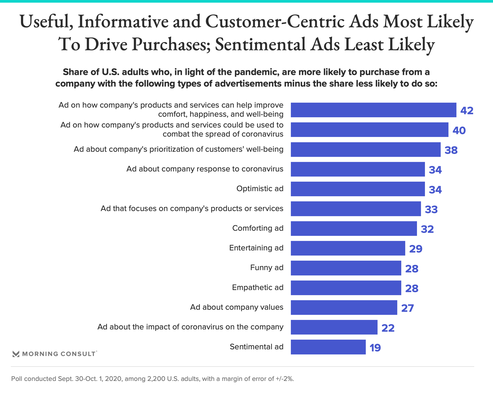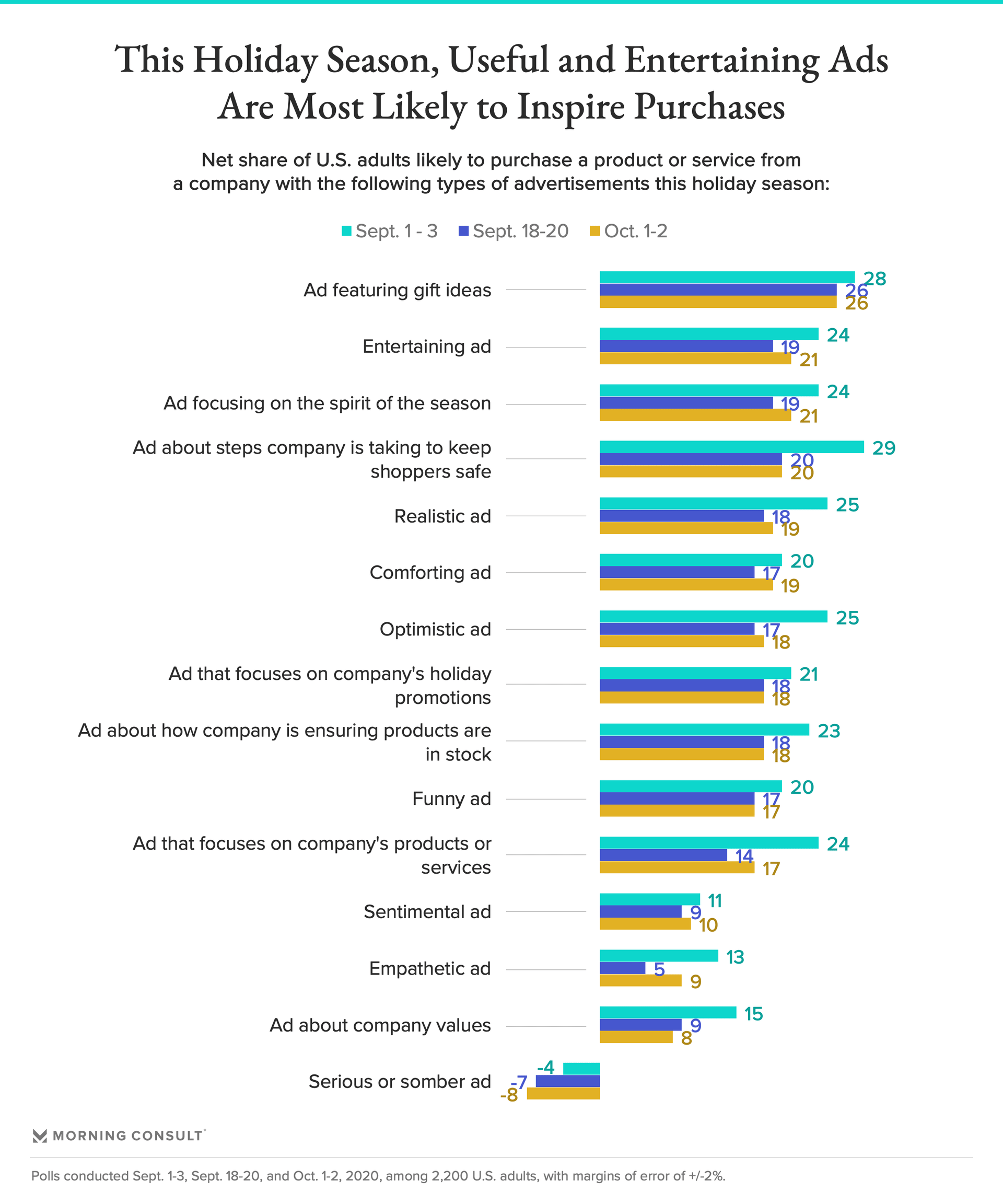 In terms of the type of advertising U.S. shoppers most want to see, general advertising preferences given the context of COVID-19 outlined above also apply to the 2020 holiday season: Serious, somber, empathetic and sentimental ads as well as ads about company values are of least interest to consumers, while useful and entertaining ads are likely to drive purchases.