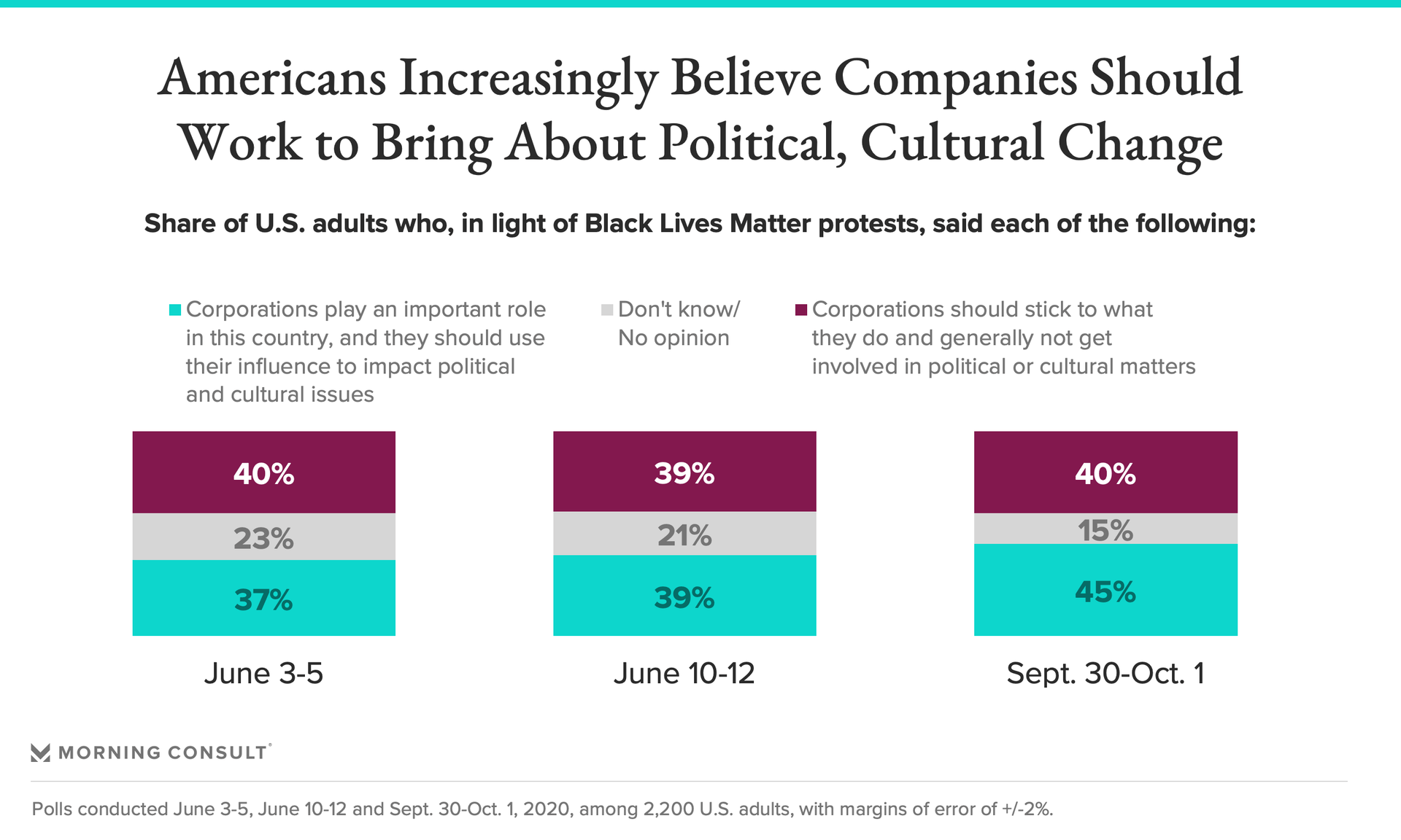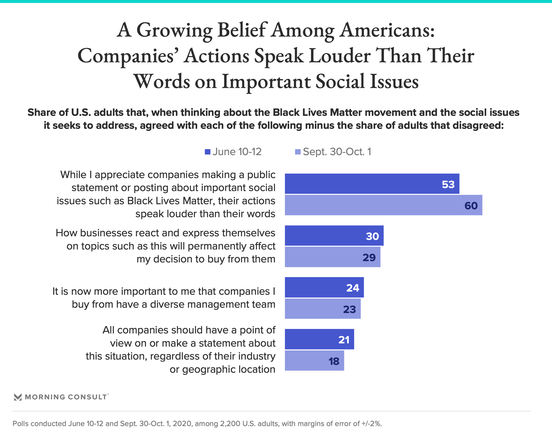 Unsurprising, then, that Americans increasingly believe that companies' actions speak louder than their words when it comes to important social issues: The share of U.S. adults who feel this way has risen to 60 percent from 53 percent in early June.