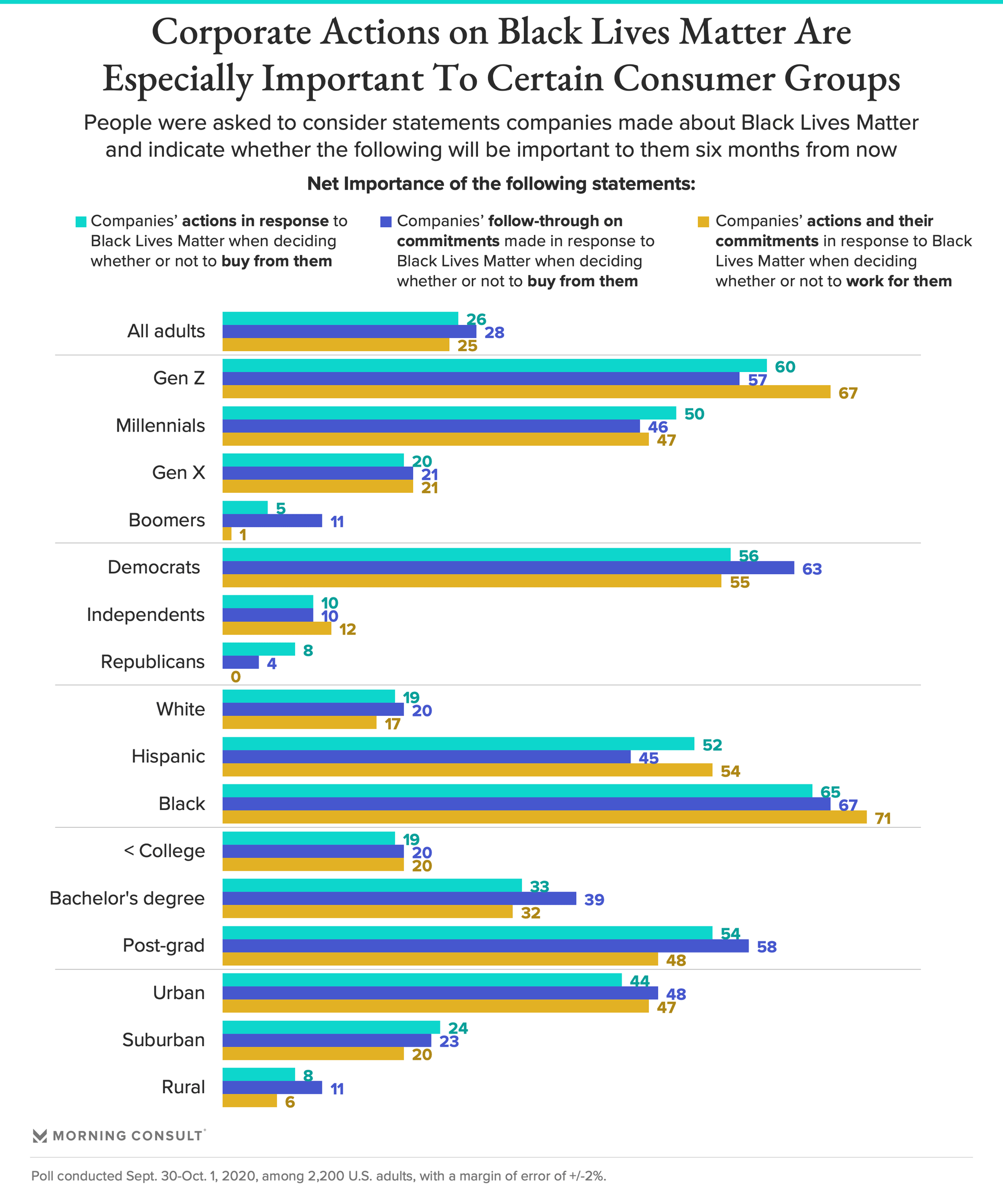 Corporate actions, statements, and follow-through as relates to Black Lives Matter are significantly more important to younger generations (Gen Z in particular), Democrats, minorities (Black Americans in particular), highly educated Americans and urbanites.