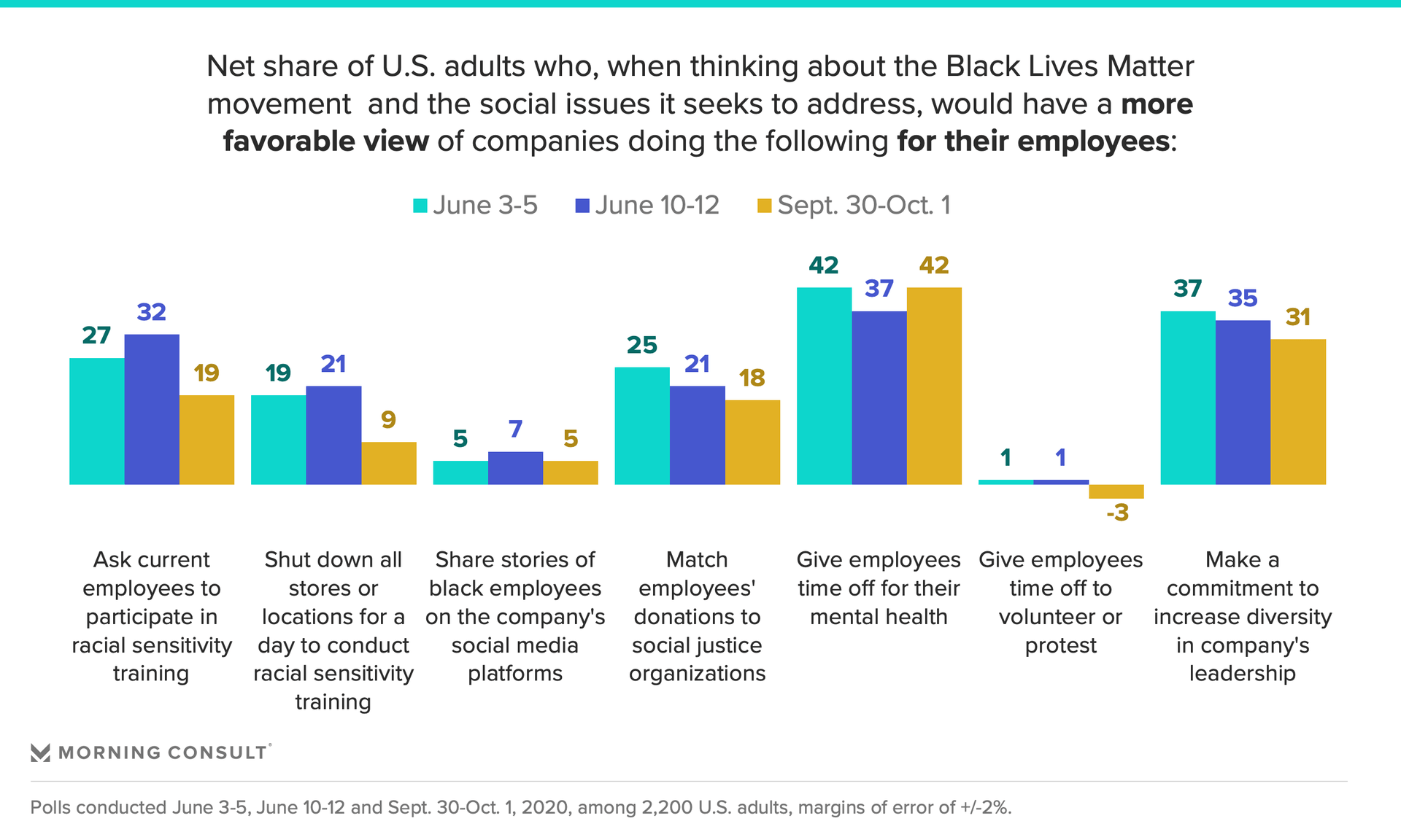 But when it comes to which actions Americans want from companies related to Black Lives Matter and the social issues this movement addresses, it appears that the popularity of many actions recommended in early June is waning. Giving employees time off for their mental health is the only action that has remained relatively steady as an initiative that would drive up the net favorability of a given company. Even commitments to increase diversity among leadership teams have declined in importance, dropping 6 points since early June.