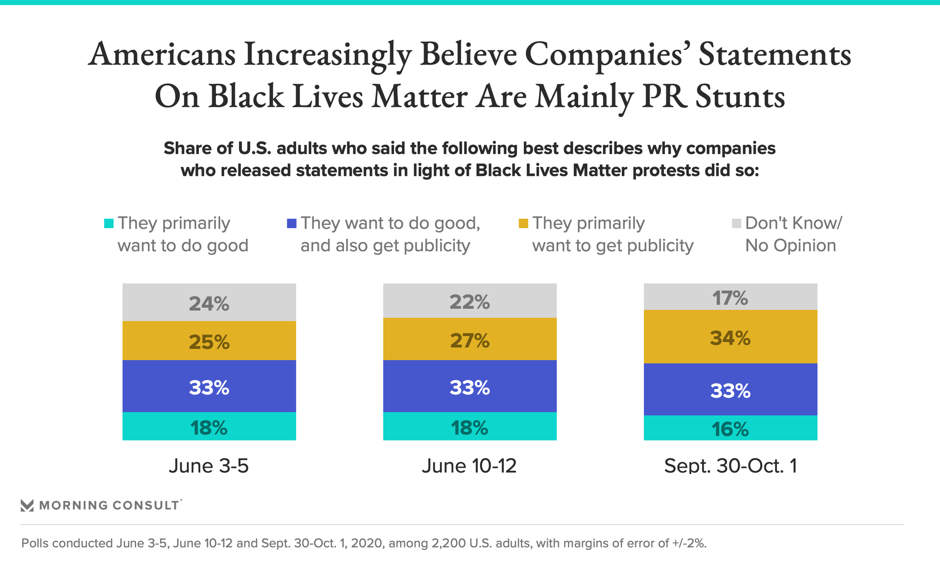 Still, Americans are increasingly skeptical of companies' motivations for making public statements around social issues such as Black Lives Matter, with a growing share feeling these efforts are primarily PR stunts.