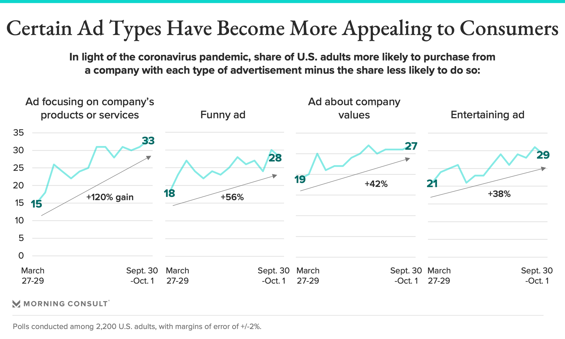 By May, Morning Consult data found more than a quarter of adults interested in ads about products and services – an 11 percentage-point uptick since late March, suggesting that consumers were increasingly craving a return to normalcy. This trend has continued: today, net likelihood to purchase from a company with ads showing its products or services has grown more than any other ad type. Funny and entertaining ads as well as those about company values have also continued to grow in appeal since the pandemic’s onset.