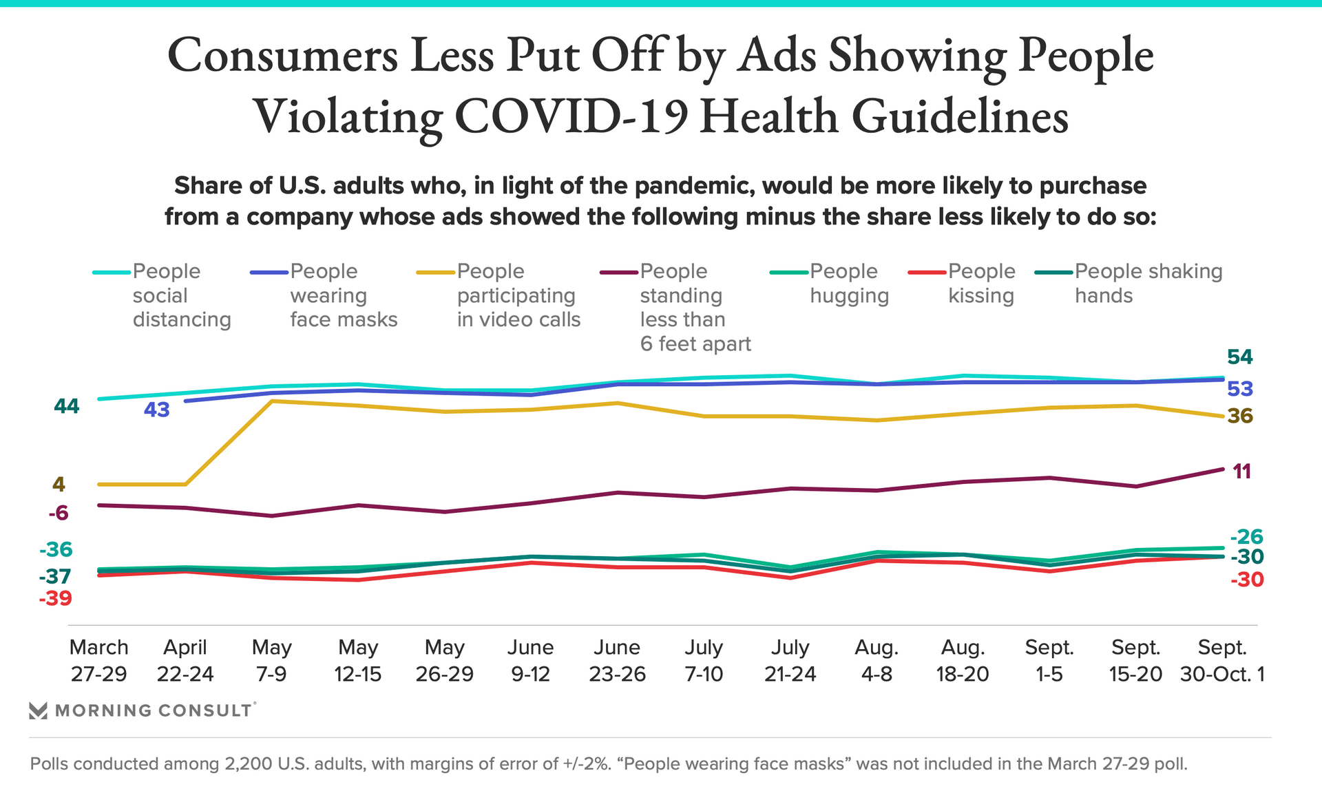 As Progressive’s CMO recently outlined, marketers have been navigating distinct phases of the pandemic, each with its own balance between normalcy and sensitivity. Reflecting the shift from initial relief and subsequent release to early stages of recovery, Americans have become increasingly open to ads with people less than 6 feet apart since March. Though still not likely to drive purchase, Americans are also slowly warming to imagery of people hugging, kissing or shaking hands.