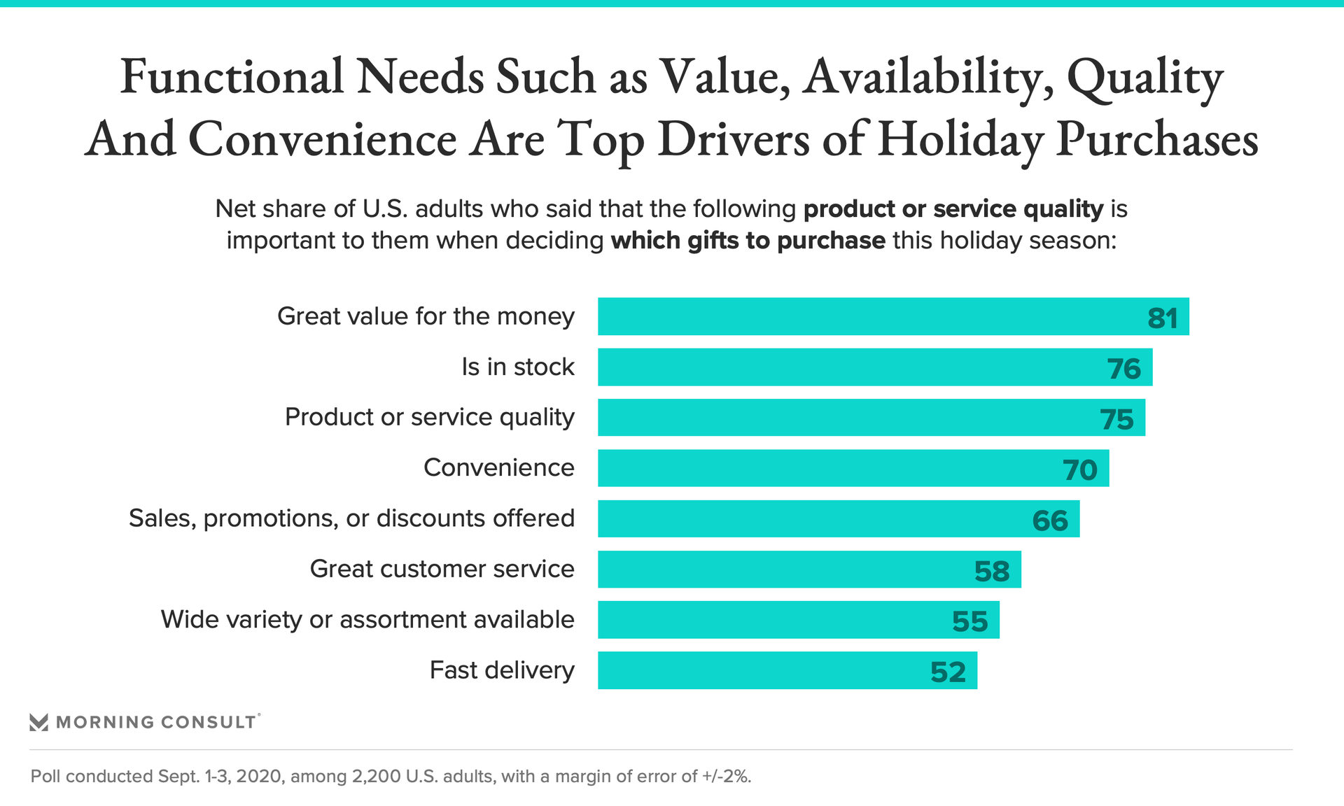 - The basics and beyond: Functional needs including value, availability and quality will be important to the vast majority of Americans’ gift purchasing decisions this holiday season, but a mix of table stake emotional needs such as a good reputation and customer security protections will also be critical for getting shoppers in the door (whether physical or virtual). Once that foundation is set, delivering on key experiential needs including convenience, customer service and a seamless shopping experience will be essential for driving purchases, and building customer relationships that last longer than the season.