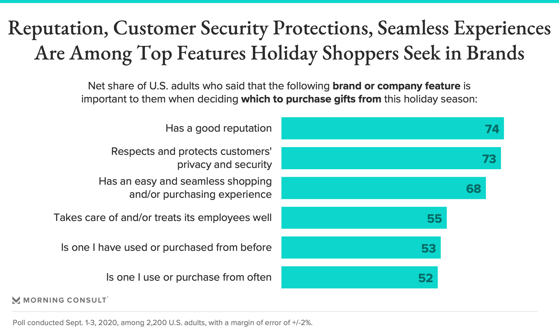 In addition to products themselves, the 2020 holiday shopper is also looking for certain qualities in the brands and companies they buy from this holiday season. Reputation, customer security protections and a seamless shopping experience are top priorities; being well-known or around for a long time are notably less important (respectively, a net of 29 and 27 consumers say these are important).