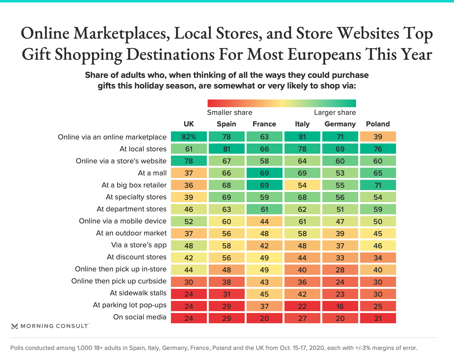 New research conducted Oct. 15-17 in the United Kingdom, Spain, France, Italy, Germany and Poland among 1,000 adults in each market aims to shed light on how the convergence of ongoing concern around the coronavirus, increased anxiety stemming from recent resurgences, and potential nostalgia, joy or relief associated with the holidays will translate for brands this season across key European markets.