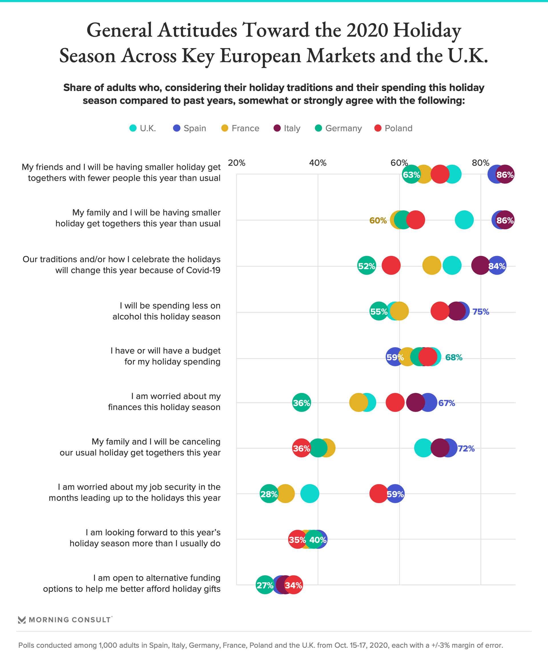 The Spanish and French in particular, as well as many in the United Kingdom, are notably more likely to say that their families are altogether canceling their usual holiday get-togethers this year. More than half of Spanish, French and Polish residents are worried about their job security in the months preceding the holidays, while this is distinctly less true for Germans (only 28 percent are worried about this).