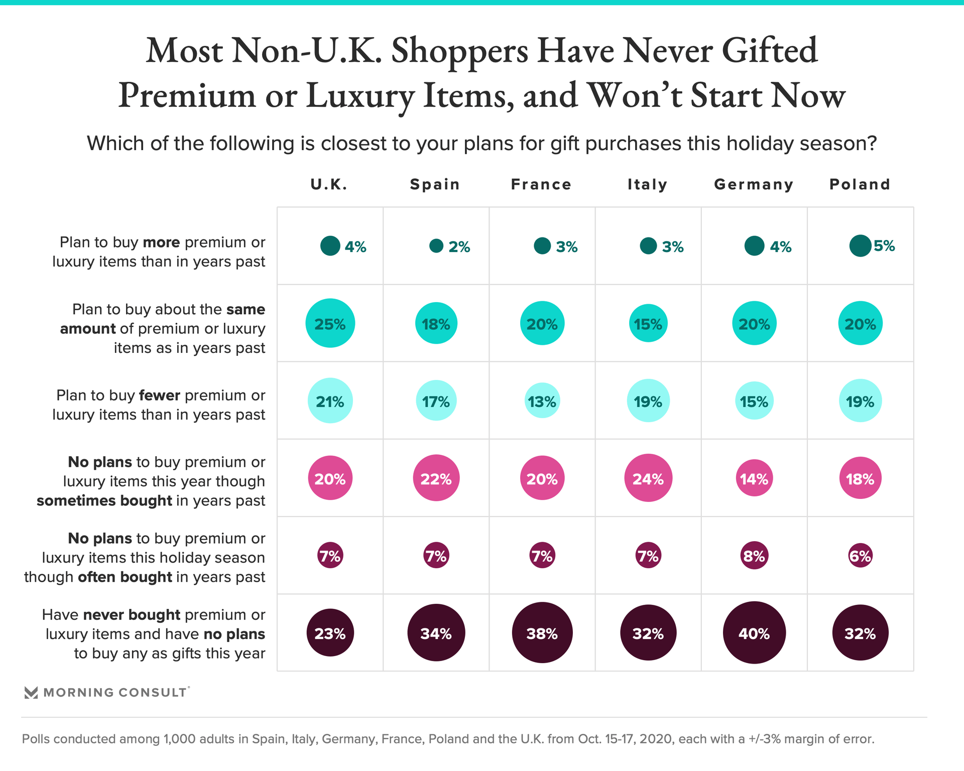 As relates to luxury and premium goods specifically, outside of the United Kingdom, most consumers in key European markets say they have never bought these items and report no plans to buy them as gifts this year. A fifth of shoppers in France, Germany and Poland and 25 percent of UK shoppers plan to buy about as many of these goods as they have in the past.