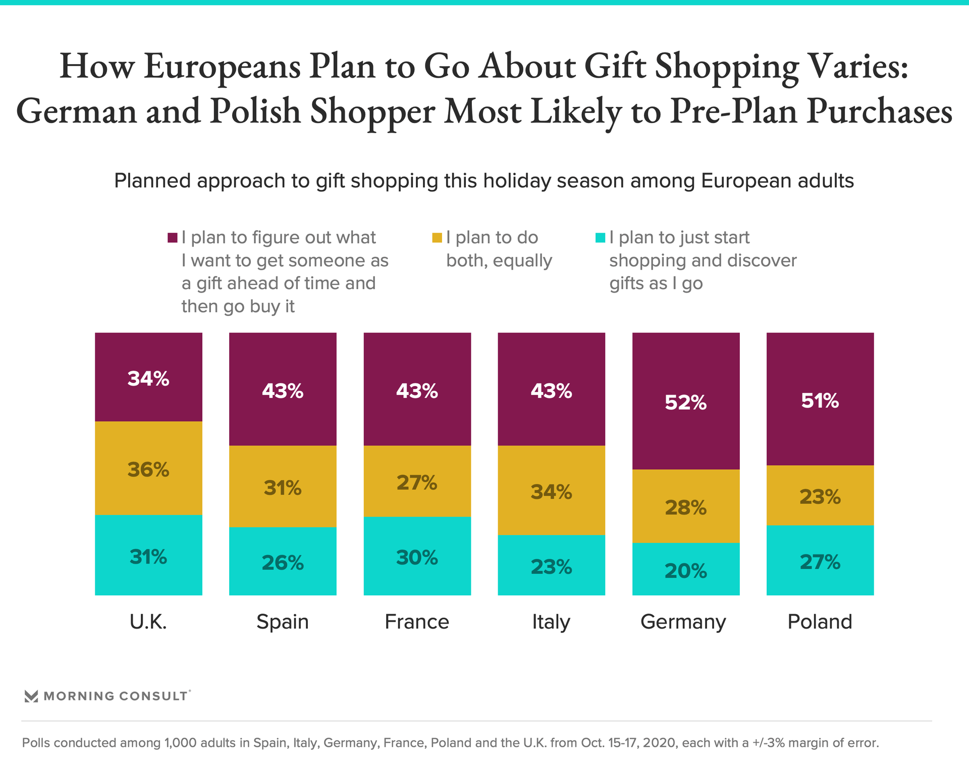The approaches European shoppers plan to employ for gift shopping perhaps unsurprisingly vary by market. UK shoppers are most likely to do a mix of pre-planning and on-the-go discovery, while the majority of Germans and Polish shoppers plan to pre-plan. Spanish, French and Italian shoppers are also most likely to pre-plan but a sizable share -- nearly 3 in 10 -- still plan to do both equally in each of these markets.
