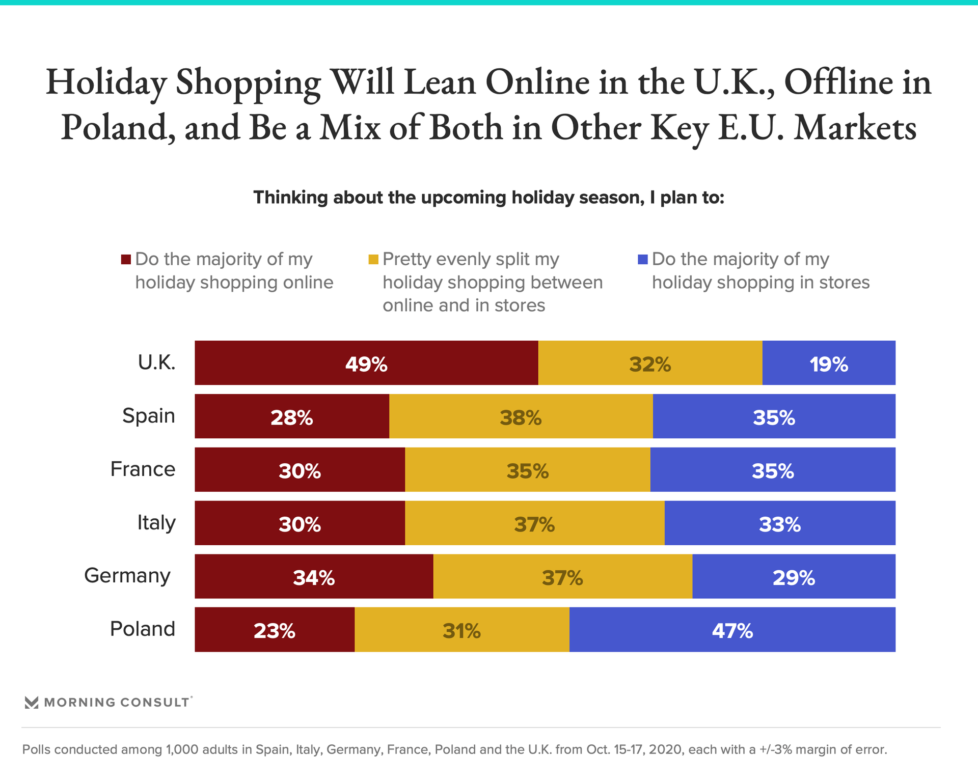 While UK shoppers are significantly more likely to do the majority of their holiday shopping online this year (49 percent plan to do so) and the Polish plan to rely mostly on in-store shopping (47 percent), a preference for online vs. offline holiday shopping is less clear-cut in other EU markets.