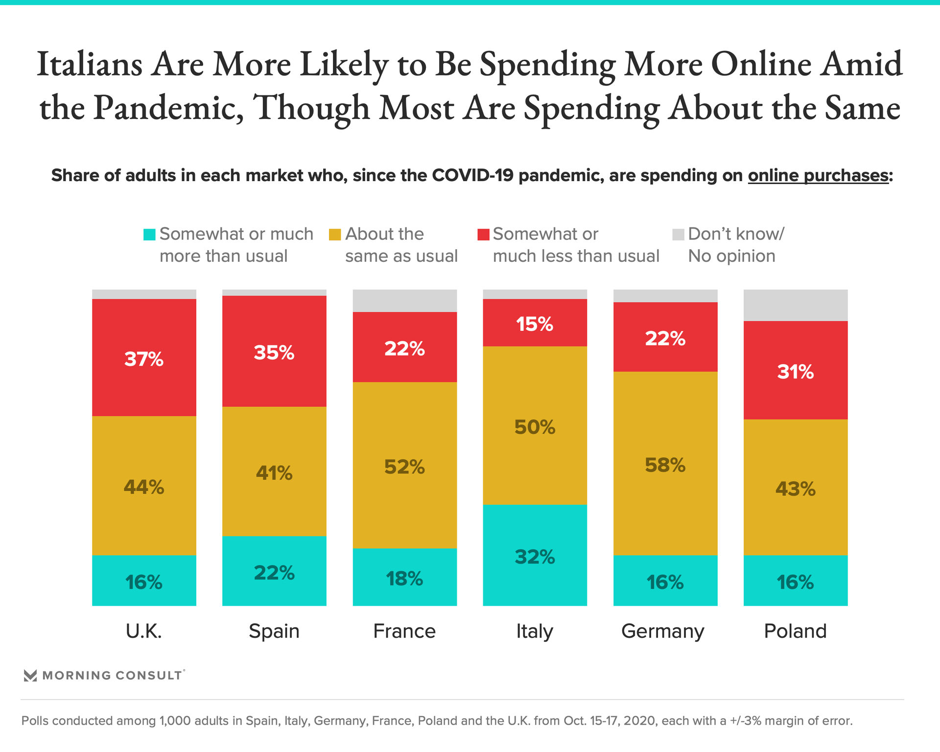 When it comes to online purchases specifically, French, Italian and German consumers are largely spending about as much as they were pre-pandemic, while sizable shares of consumers in the UK, Spain and Poland are now spending less online than they were before the pandemic. Roughly a third of Italians, 32 percent, report spending more online at this time than they usually did, the largest share doing so across the EU markets surveyed.