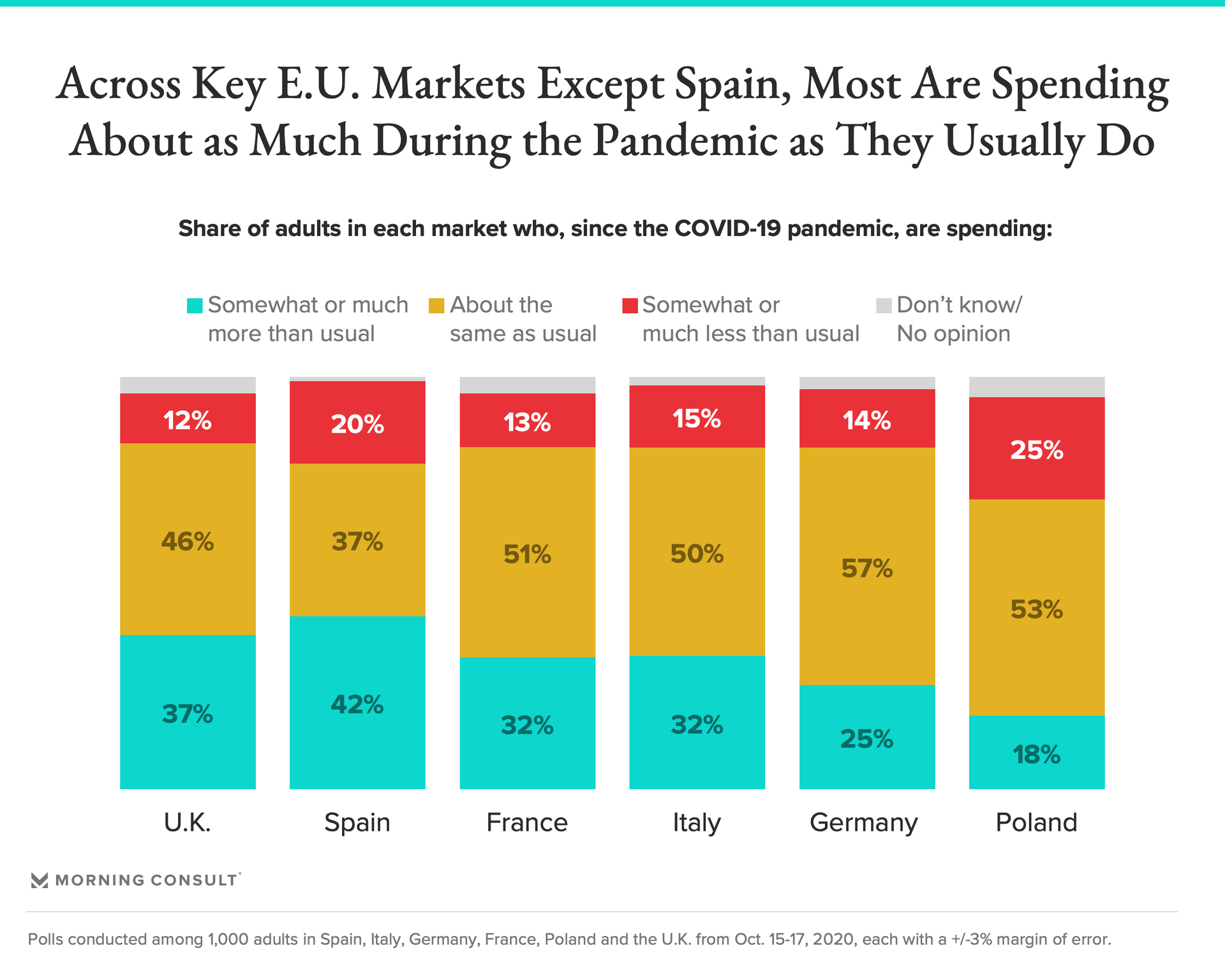 Still, with the exception of Spain, most consumers in each E.U. market surveyed report spending about as much during the pandemic as they usually do (42 percent of Spanish report spending somewhat or much more than in non-pandemic times vs. 20 percent spending somewhat or much less). Conversely, 25 percent of Polish respondents are spending somewhat or much less and just 18 percent of consumers in that market are currently spending more.
