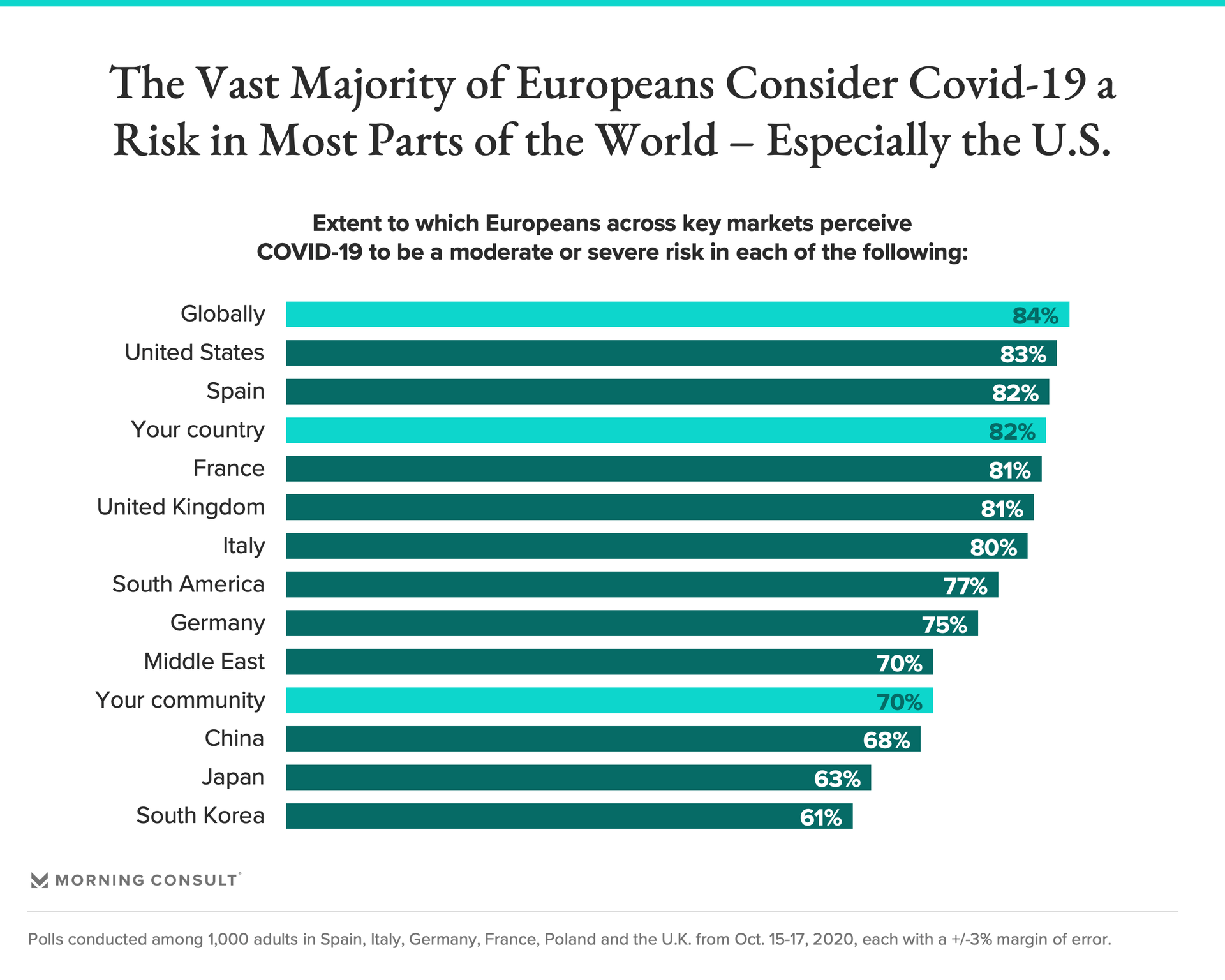 As coronavirus outbreaks reach new highs, the vast majority of Europeans on average recognize COVID-19 to be a risk globally and in most parts of the world -- particularly in the United States and in their own country.