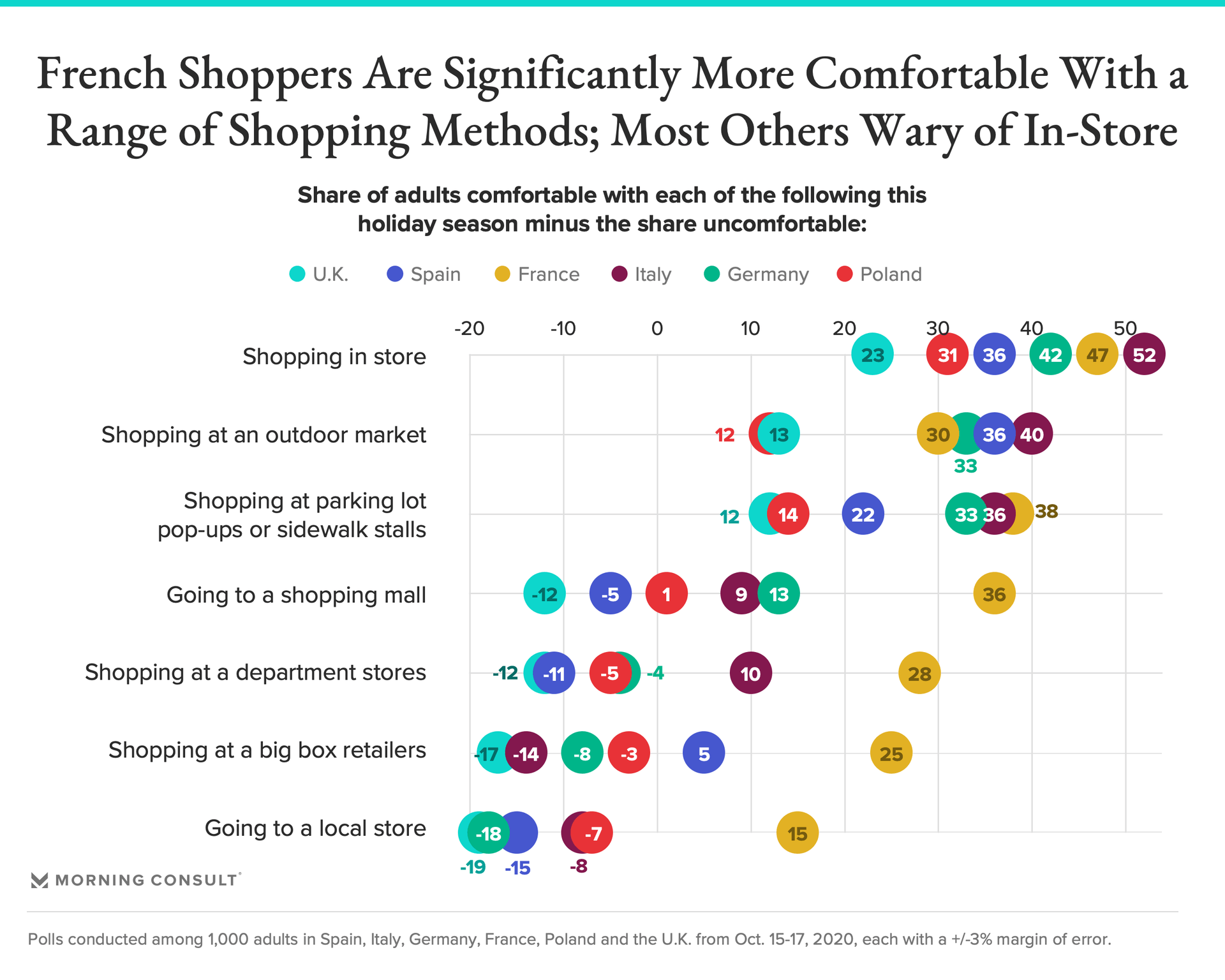 Related to those concerns, with the exception of the French, only a small net share of shoppers across markets is comfortable shopping in-store or at outdoor markets, parking lot pop-ups or sidewalk stalls. And in many markets, decidedly more shoppers are uncomfortable shopping at department stores, big box retailers or local stores this year than the share that says they are comfortable doing so.